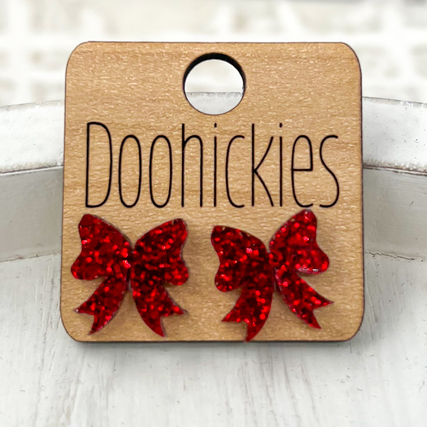 Add a pop of color to your outfit with these playful Acrylic Glitter Red Bow Earrings. These lightweight studs are sure to make a statement and add a touch of fun to your look. Perfect for any occasion, these earrings are a must-have for any fashion-forward individual!