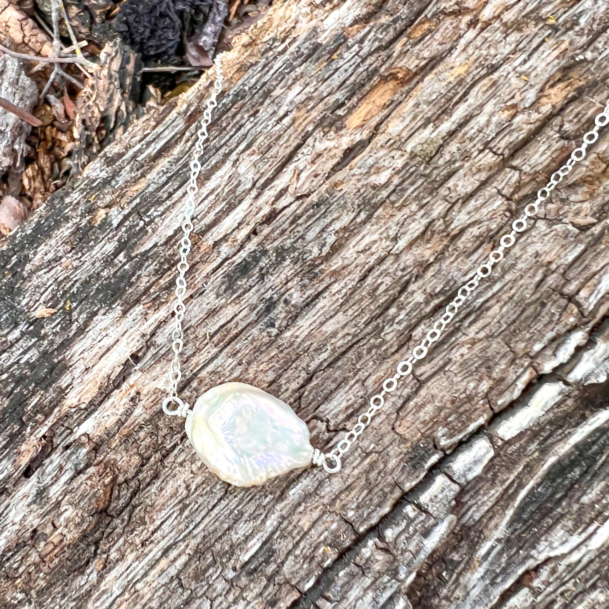 Beautiful single Baroque Pearl Necklace suspended from a delicate 16 inch sterling silver chain.  Each pearl is wire wrapped by hand to secure it firmly to the necklace!  Pearls may have bumps or pits which is normal for cultured pearls and adds to the unique one of a kind statement piece!