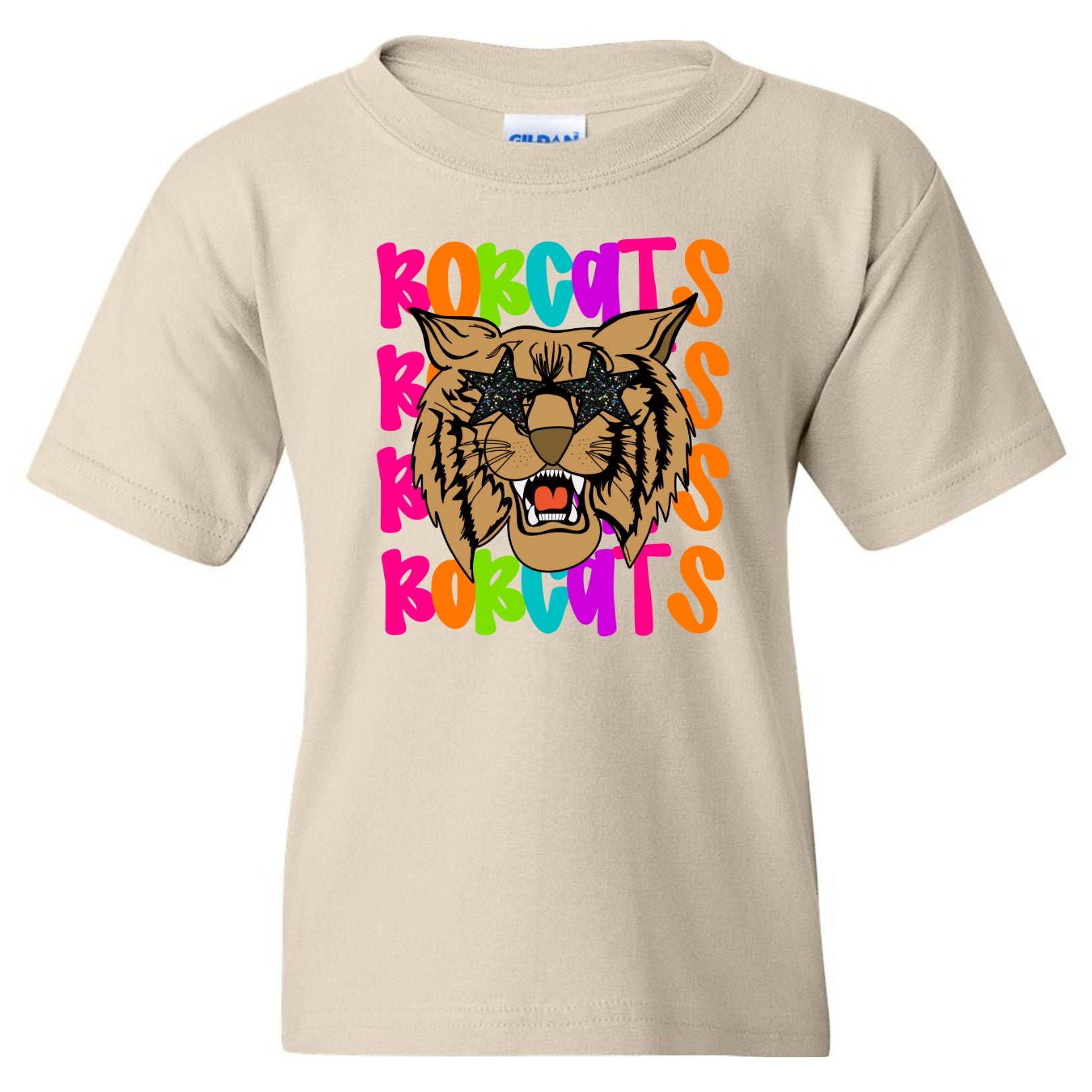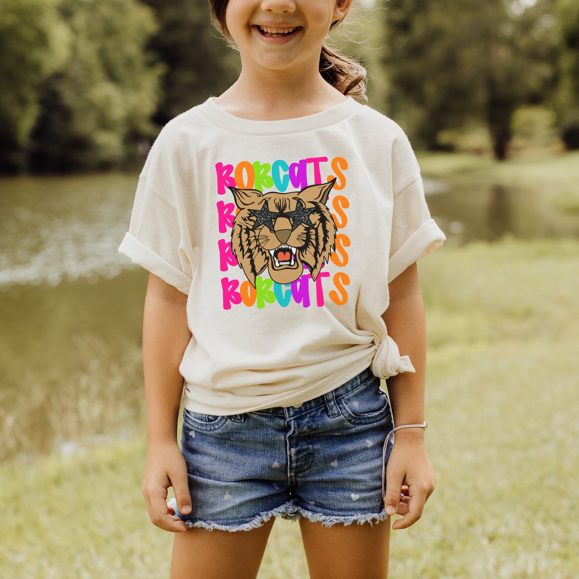 This bright and cheerful kids' t-shirt is full of personality, featuring a fierce Bobcat mascot rocking cool star-shaped sunglasses. The vibrant, multi-colored "BOBCATS" text adds an extra pop of fun, making this shirt a perfect way to show school spirit in style!