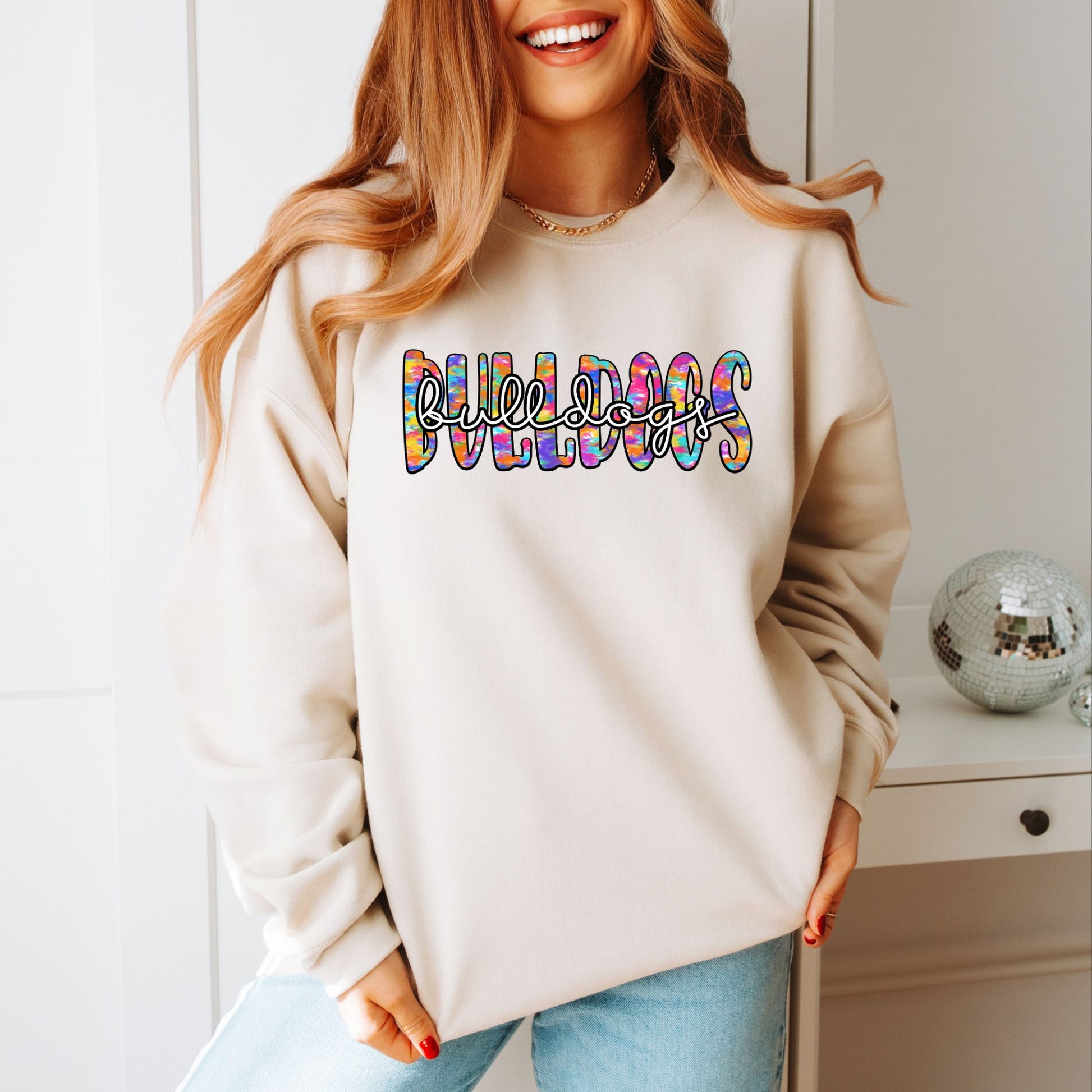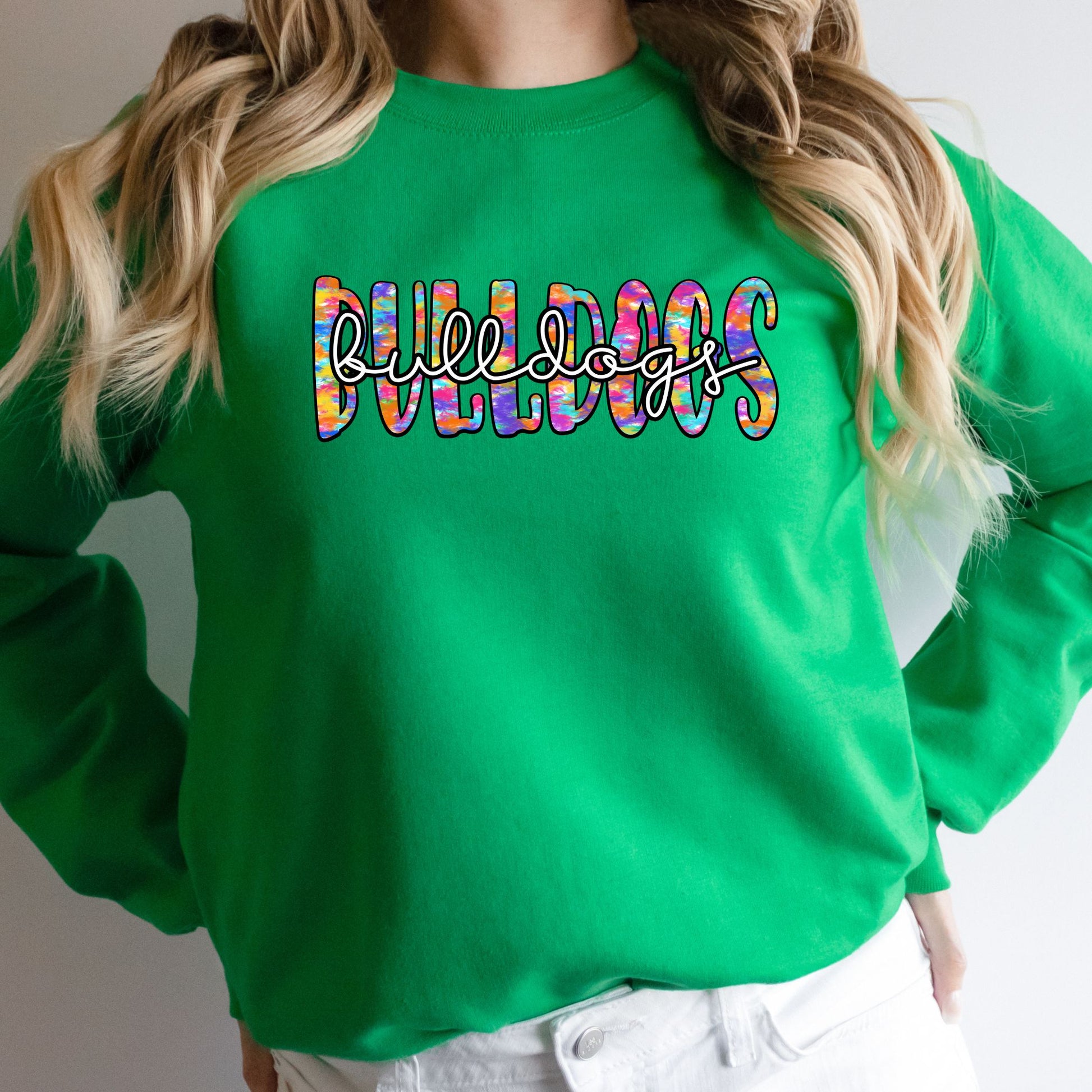 Stand out and show off your team spirit with our Bulldog Sweatshirt in a unique Tye Die print. Cheer on your team in style with this vibrant and comfortable sweatshirt. Go Bulldogs!