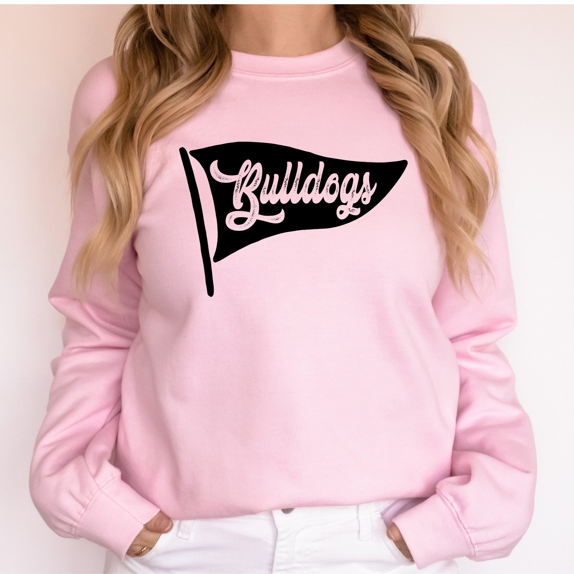 Cheer on your Bulldogs in this playful Bulldogs Pennant Team Sports Sweatshirt. Featuring a bold pennant design, it brings a sporty vibe to your wardrobe while keeping you cozy and comfy. Perfect for fans who want to show team pride with a fun, casual twist!