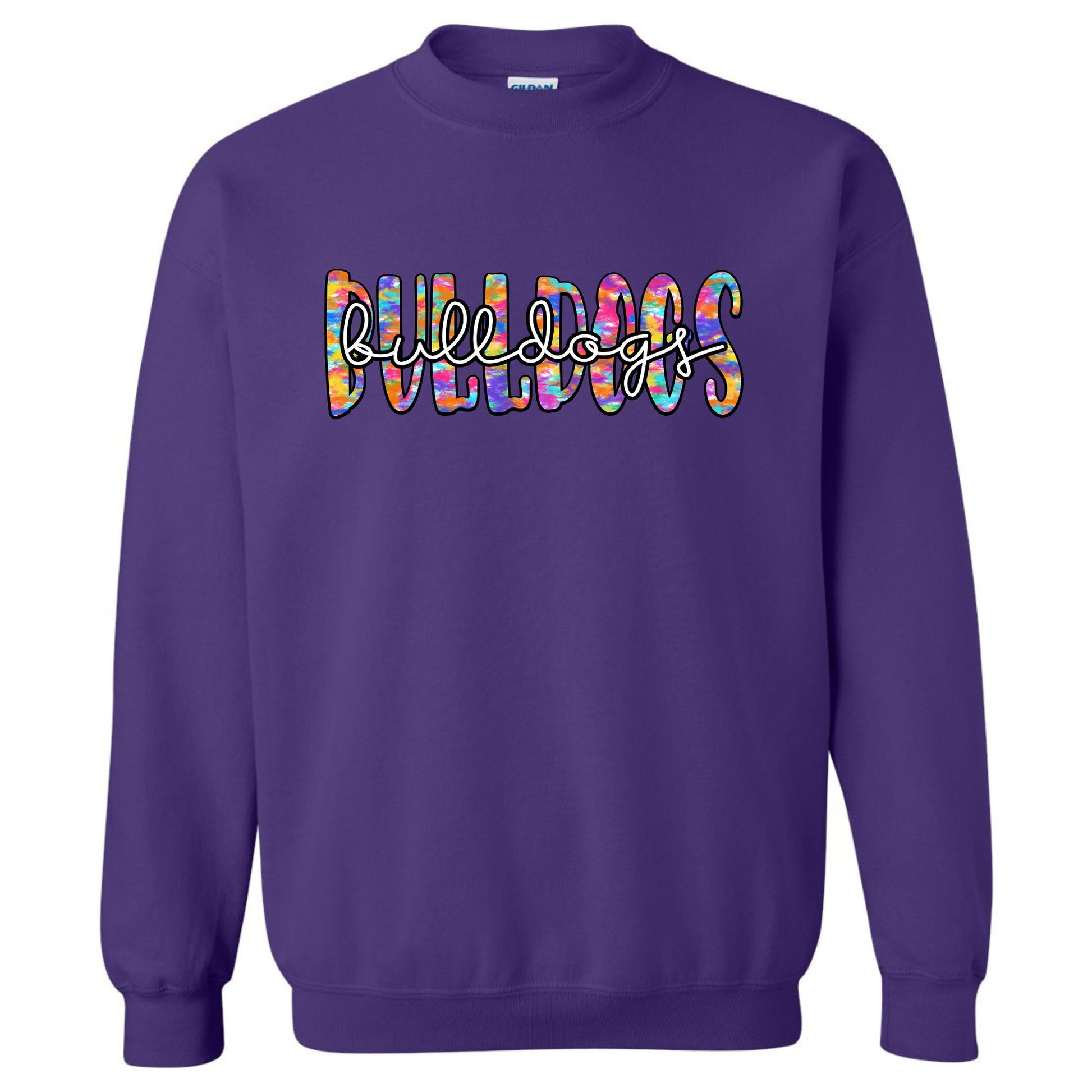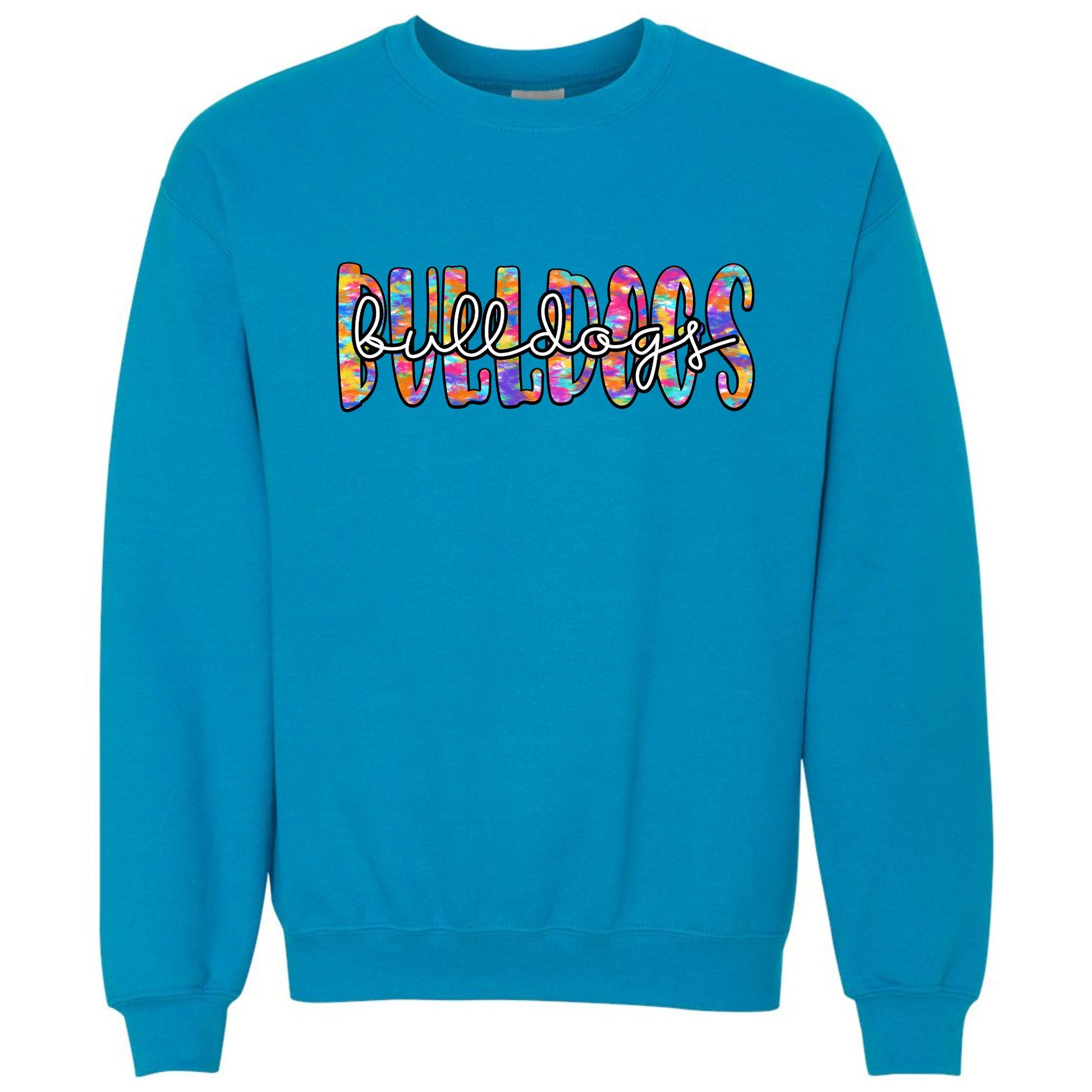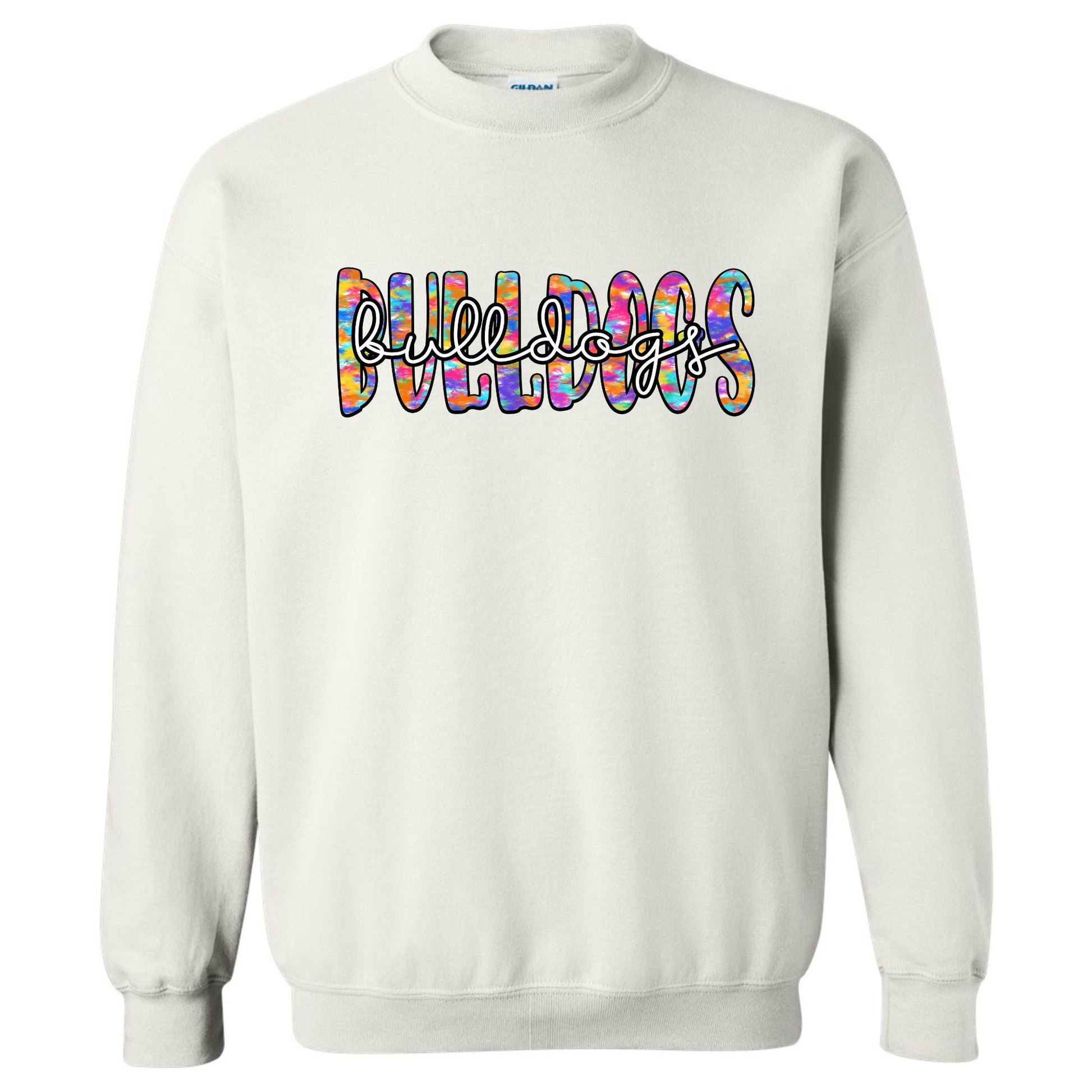 Show your school spirit in style with this Bulldogs Tie Dye Print Sweatshirt. Featuring colorful tie dye letters spelling out "Bulldogs," this cozy sweatshirt adds a fun, vibrant twist to your casual look. Perfect for game days or lounging around, it’s comfy, eye-catching, and sure to brighten up any outfit.