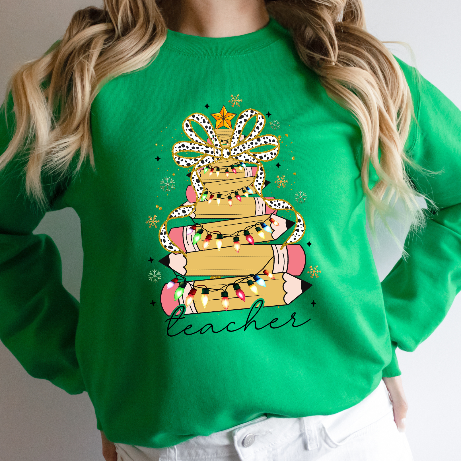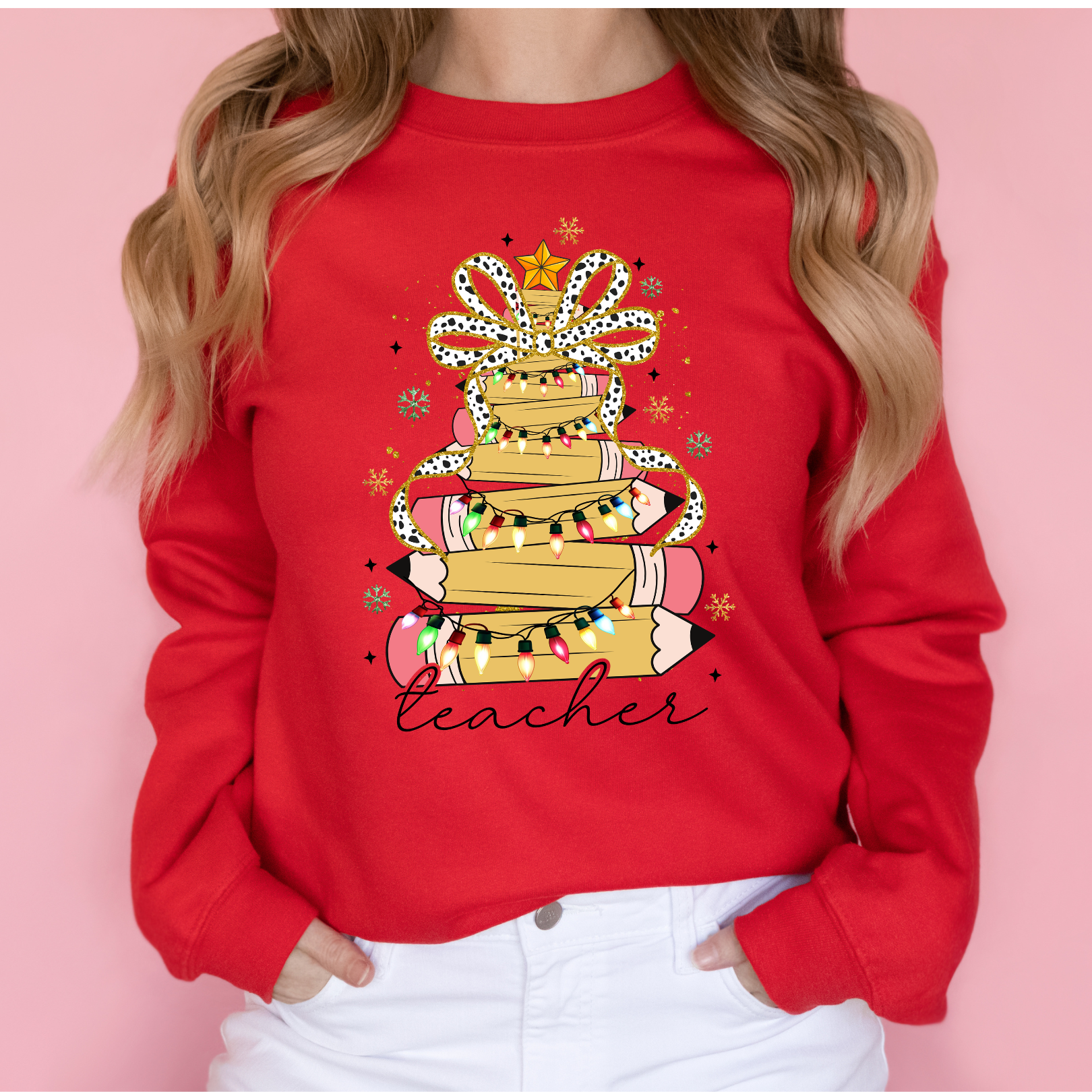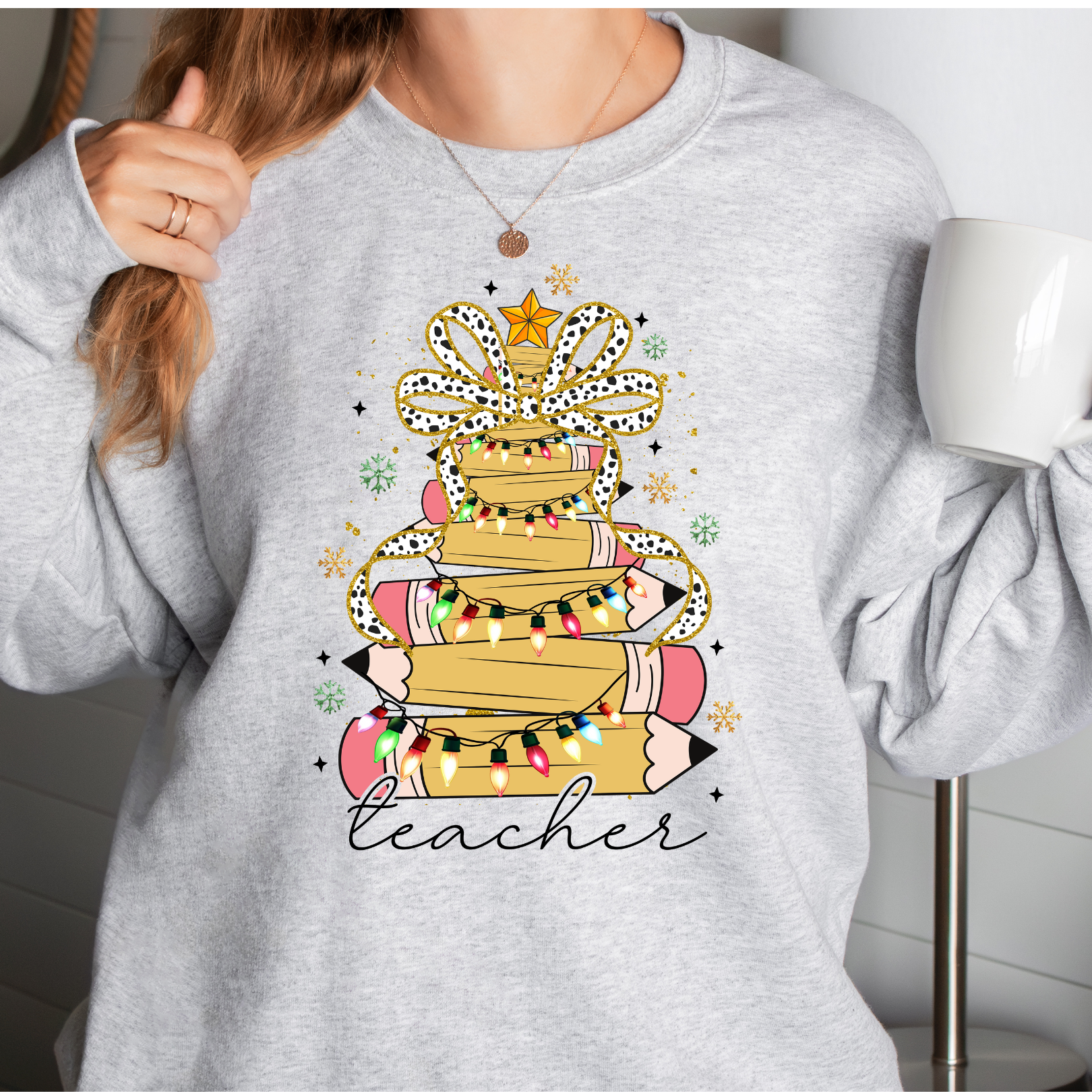 Introducing the Teacher Pencil Christmas Tree Sweatshirt, the perfect gift for your favorite educator! This cute and quirky tshirt features a festive Christmas tree made entirely out of pencils, sure to bring a smile to any teacher's face. Get yours today and spread some holiday cheer!