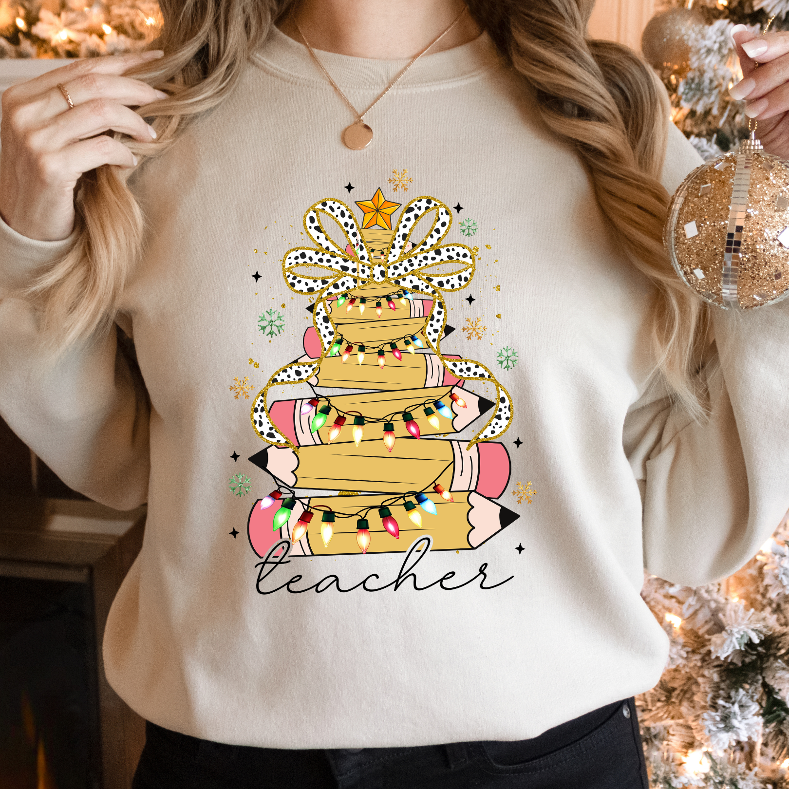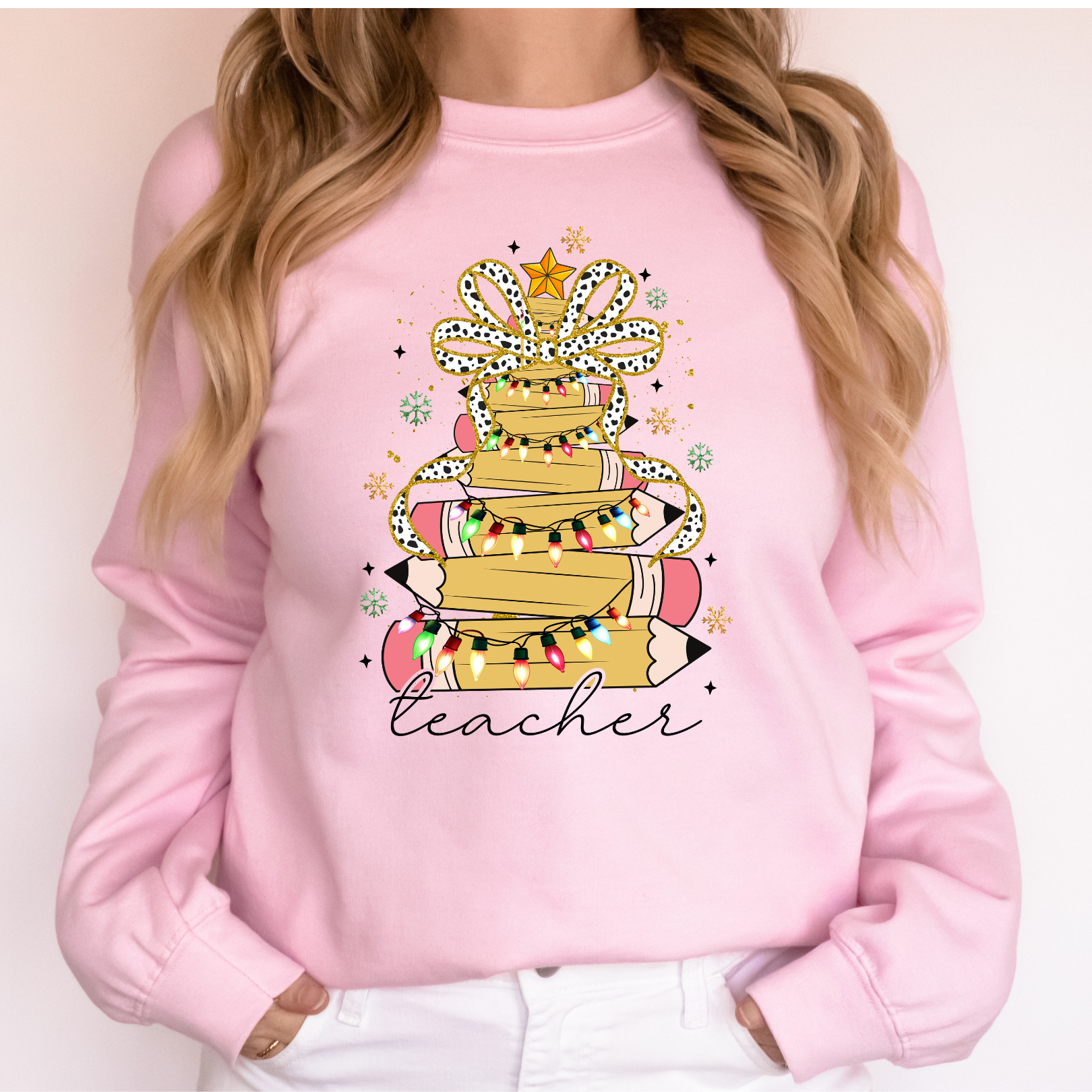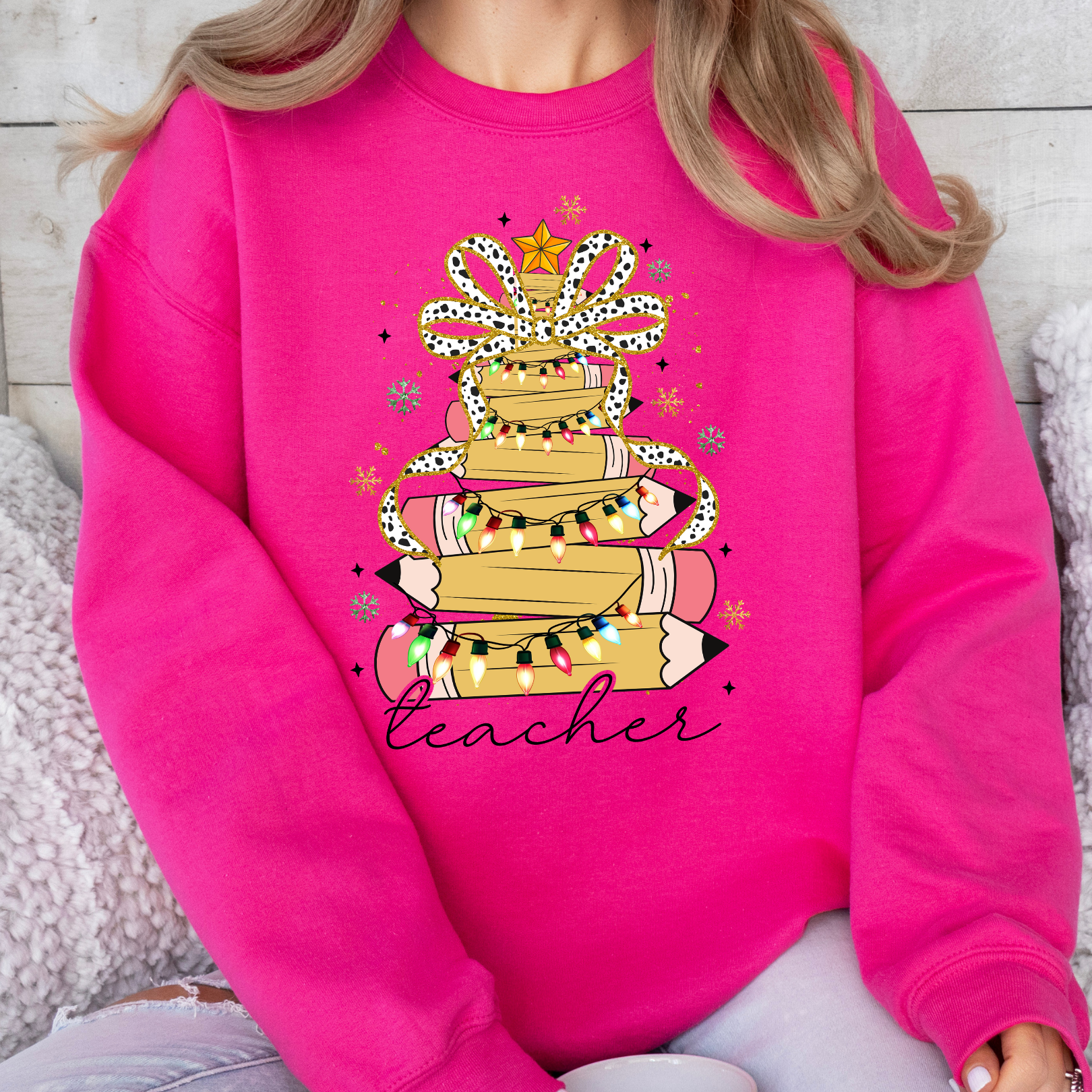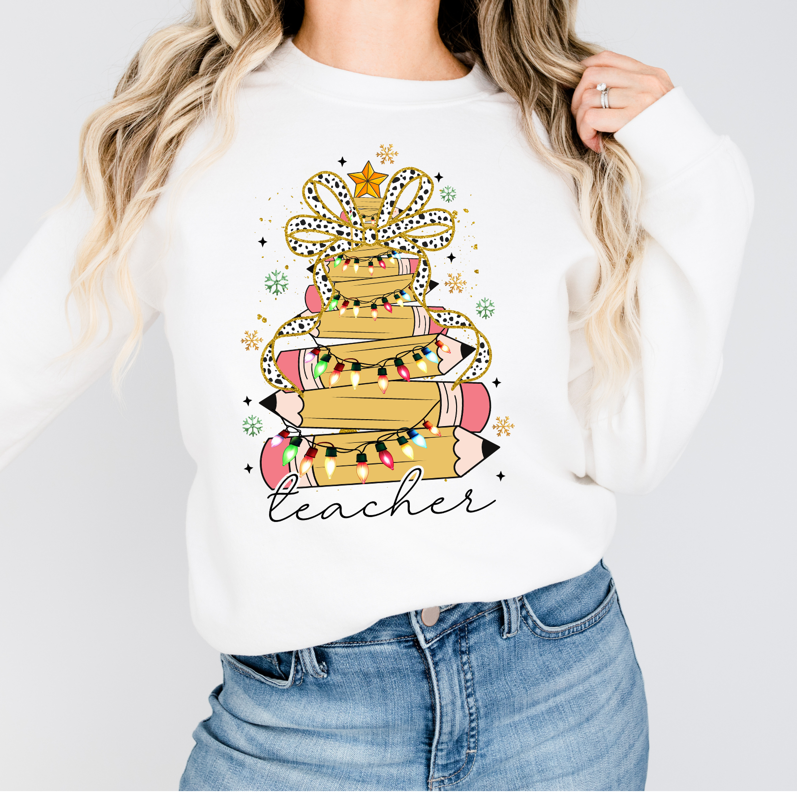 Introducing the Teacher Pencil Christmas Tree Sweatshirt, the perfect gift for your favorite educator! This cute and quirky tshirt features a festive Christmas tree made entirely out of pencils, sure to bring a smile to any teacher's face. Get yours today and spread some holiday cheer!