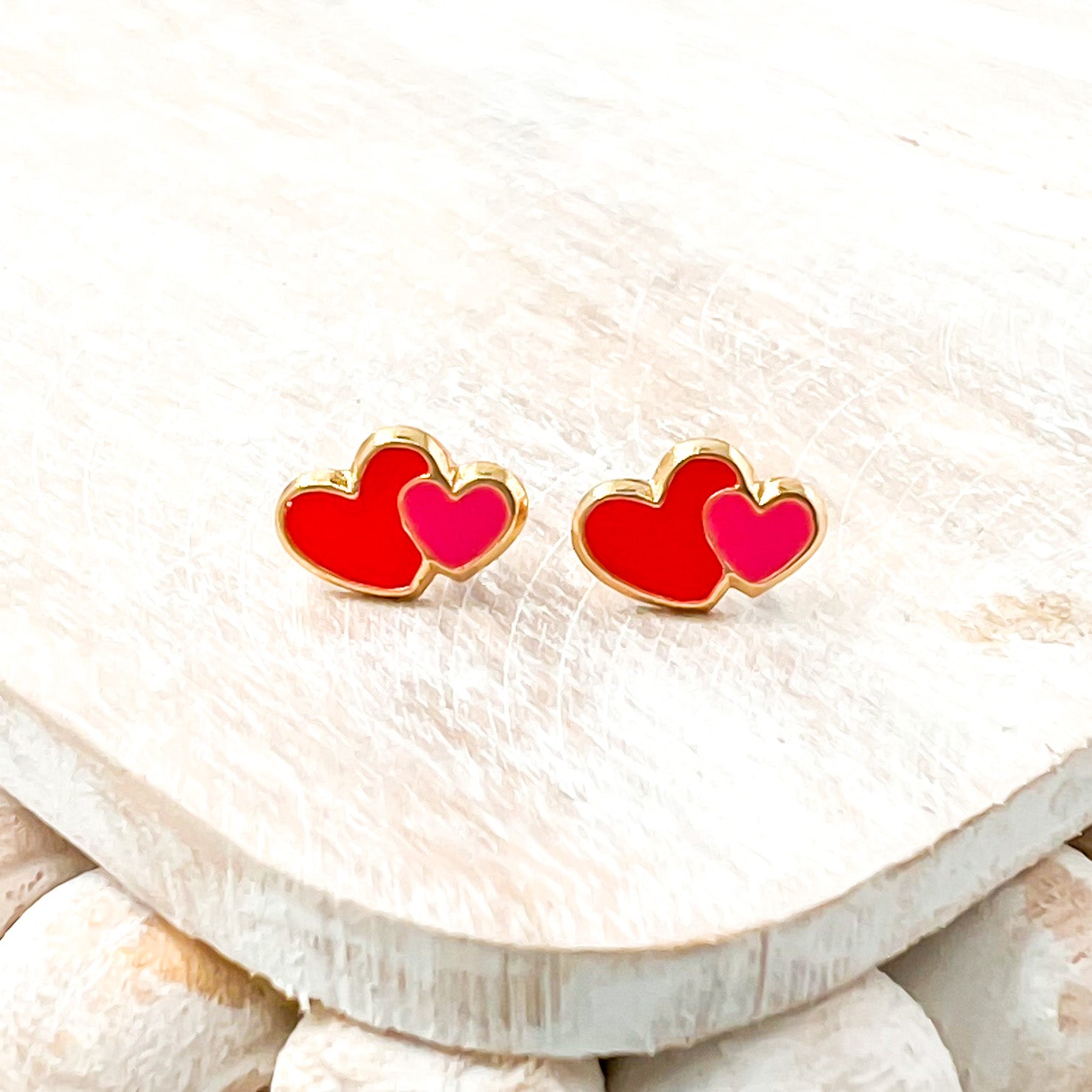Gold with Pink and Red Hearts Sterling Silver Stud Earrings