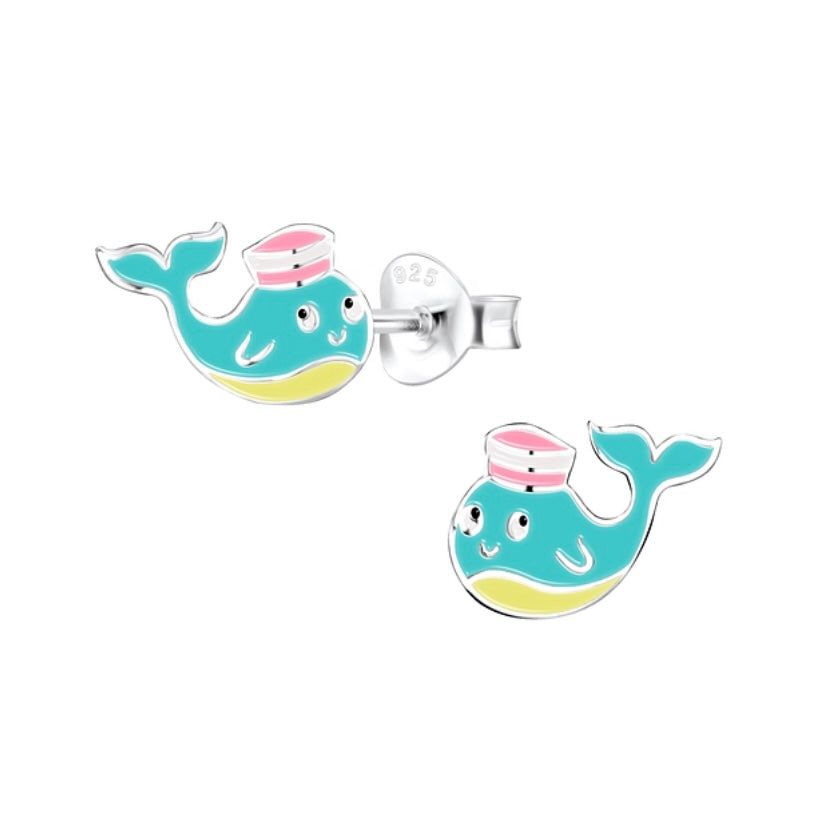 Teal Whale with Pink Sailor Cap Sterling Silver Stud Earrings