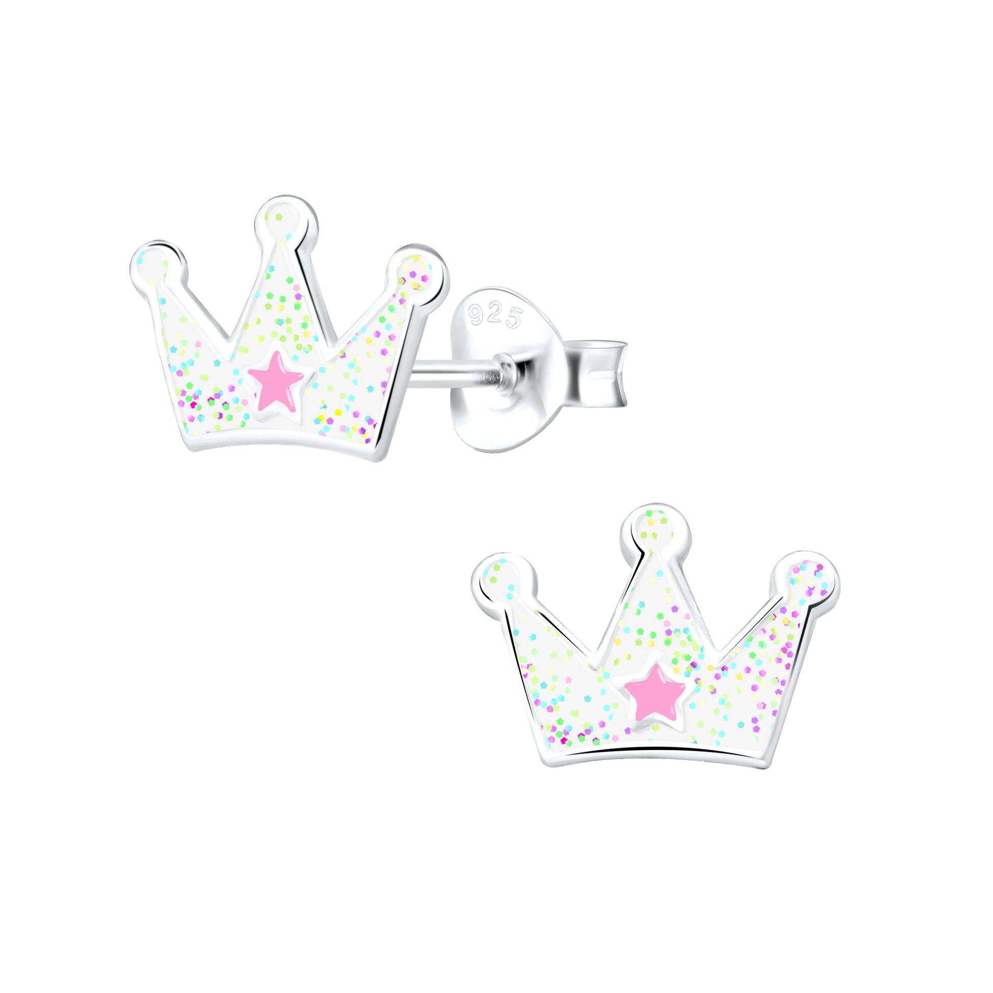 Indulge in the royal treatment with our White Glitter Princess Crown Sterling Silver Earrings. Made with hypoallergenic sterling silver, these earrings feature a dazzling white glitter crown design fit for a princess. Perfect for any occasion, these earrings will add a touch of sparkle to your look with every wear.