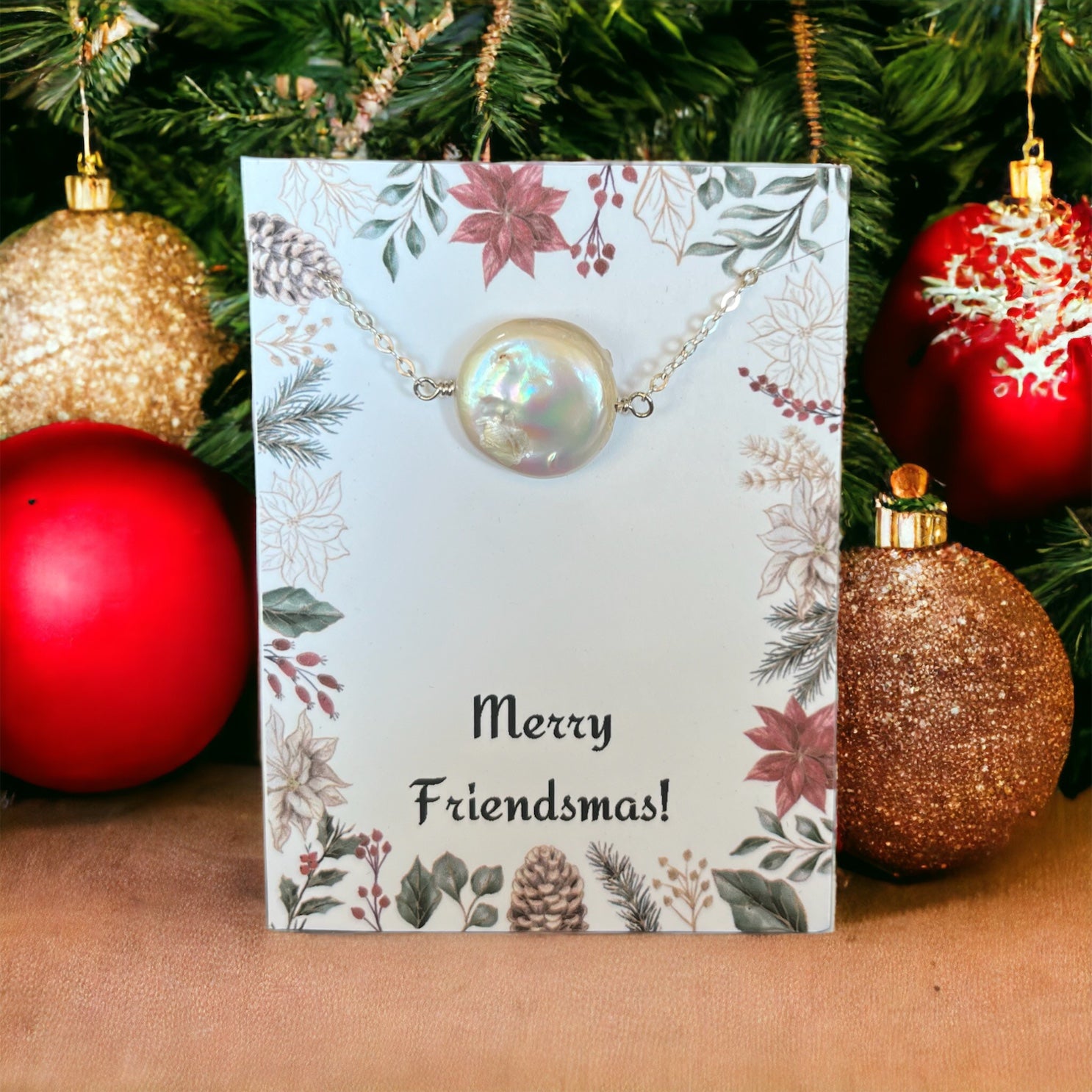 Celebrate the spirit of togetherness with our enchanting "Merry Friendsmas" pearl necklace! Crafted delicately with lustrous pearls and sterling silver, this exquisite piece embodies elegance and warmth, perfect for the holiday season.