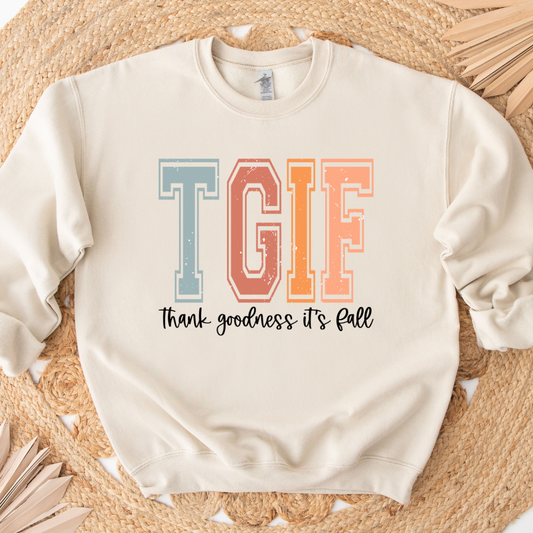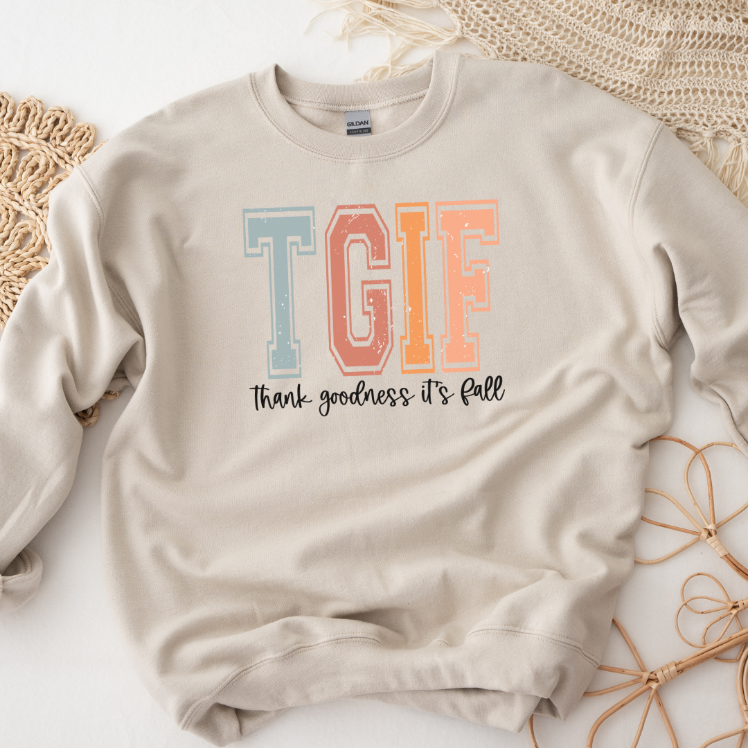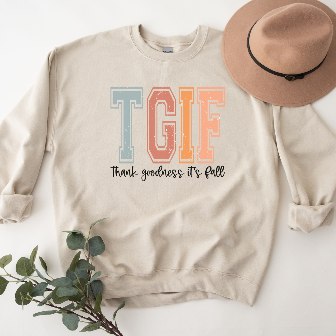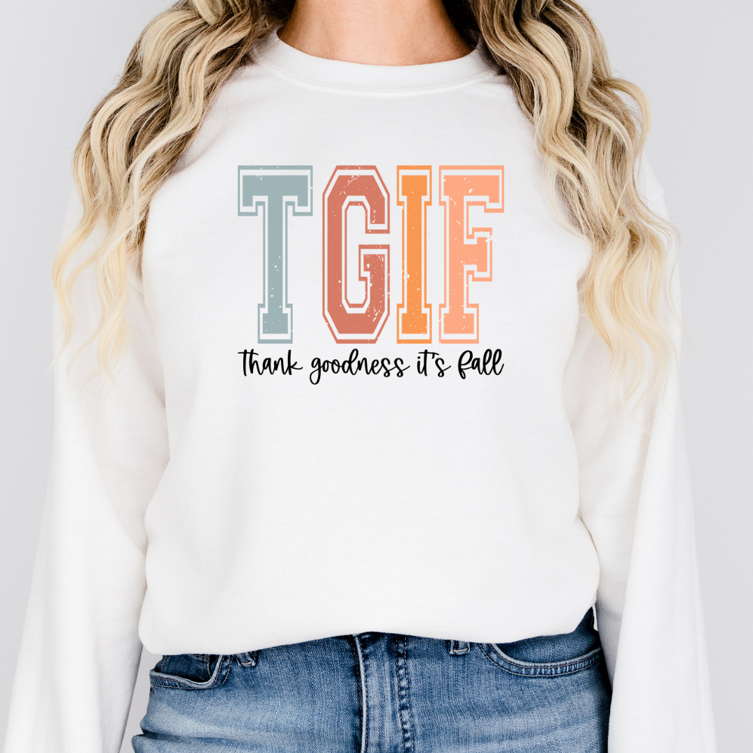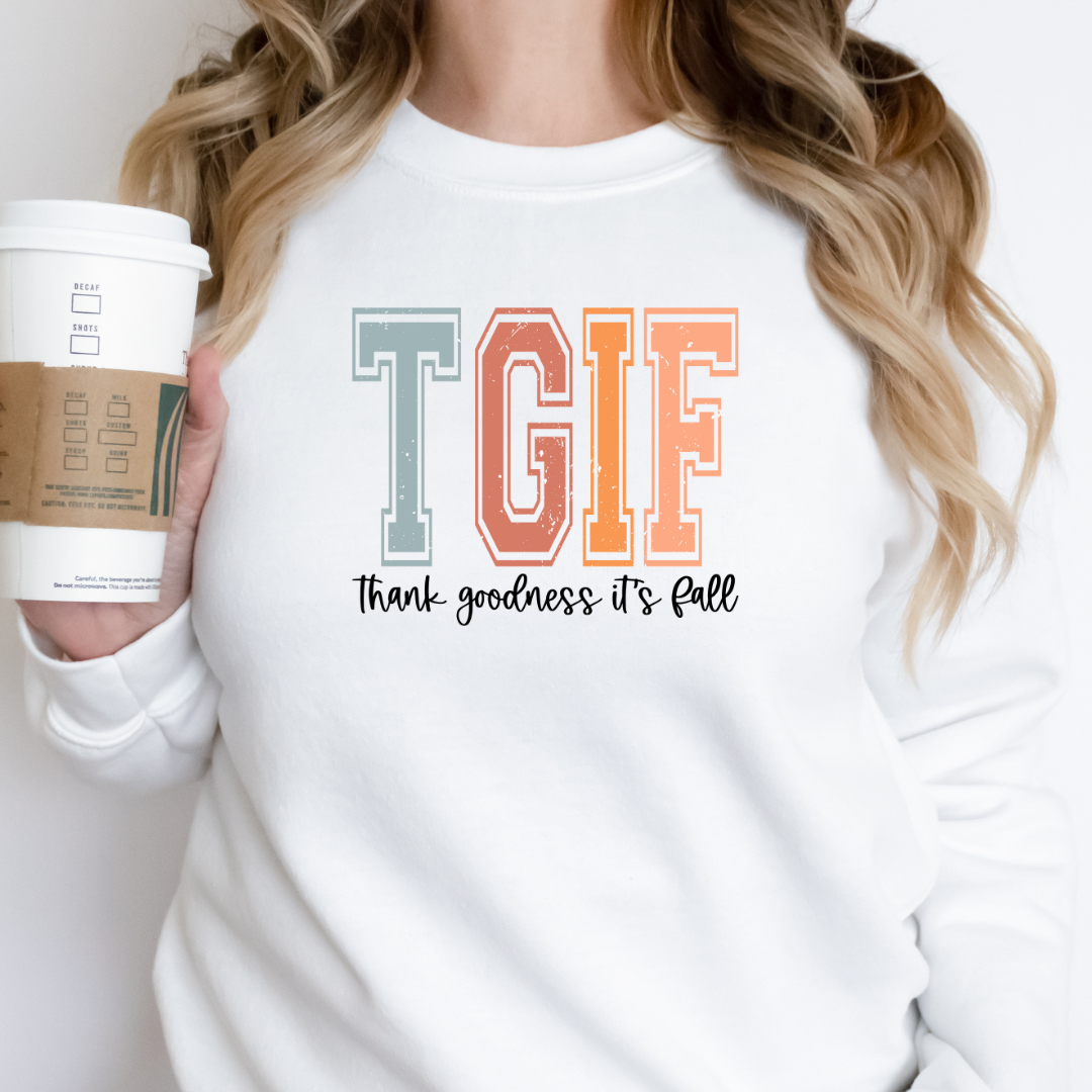 Celebrate the arrival of cozy sweaters, pumpkin spice everything, and the vibrant colors of autumn with our "TGIF: Thank Goodness It's Fall" sweatshirt. πŸβ˜•πŸ§₯