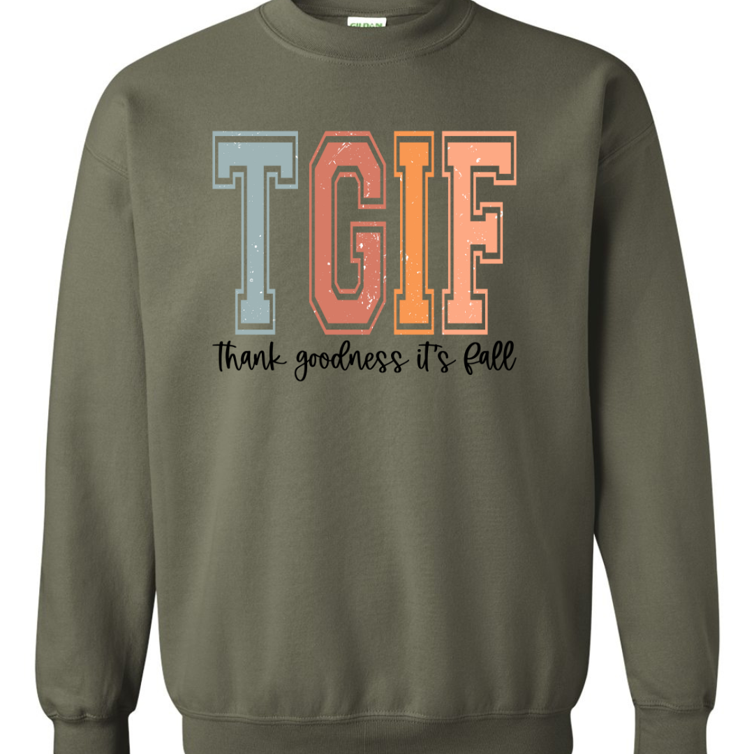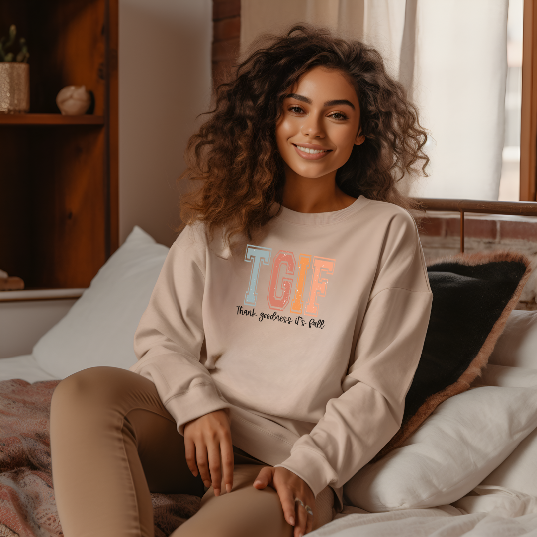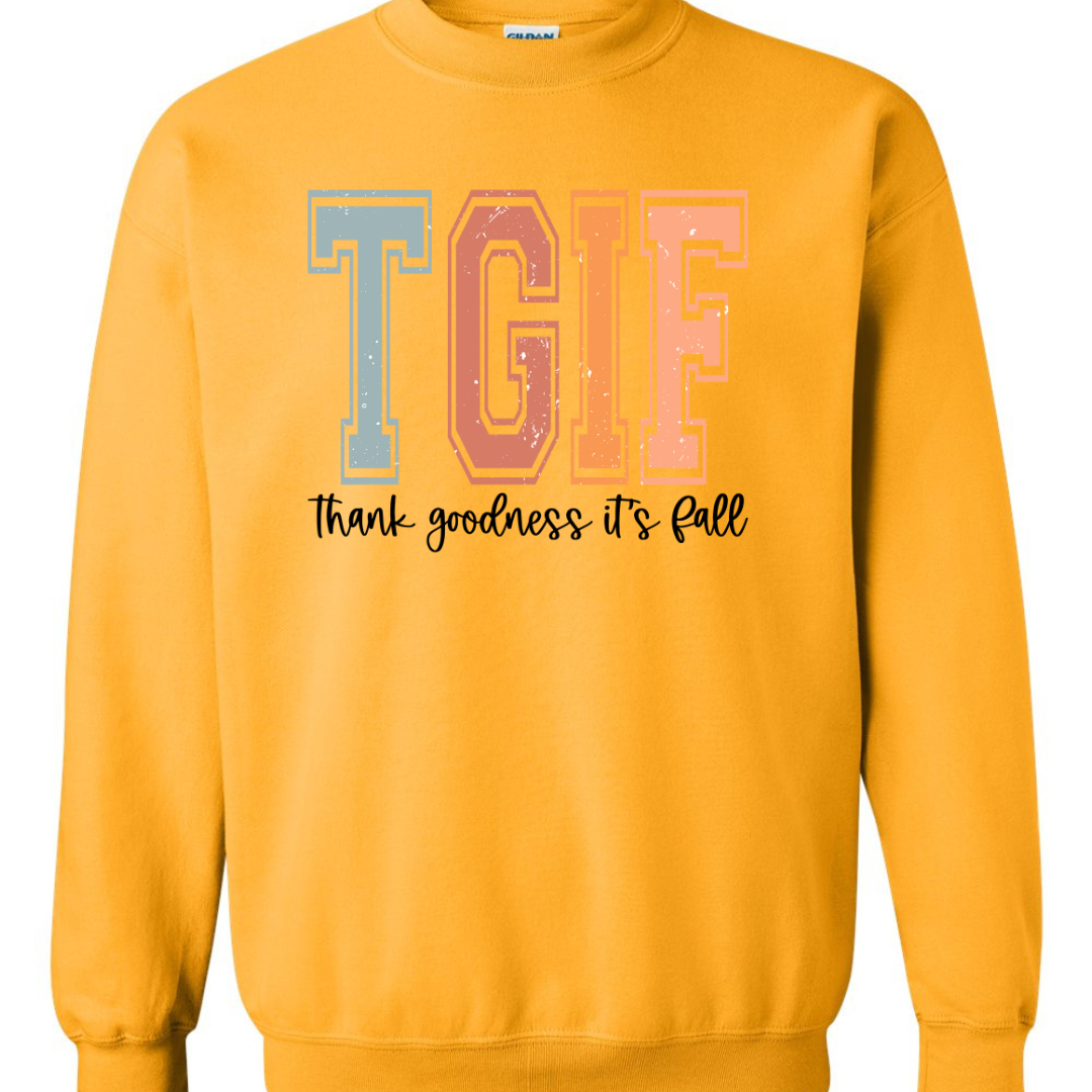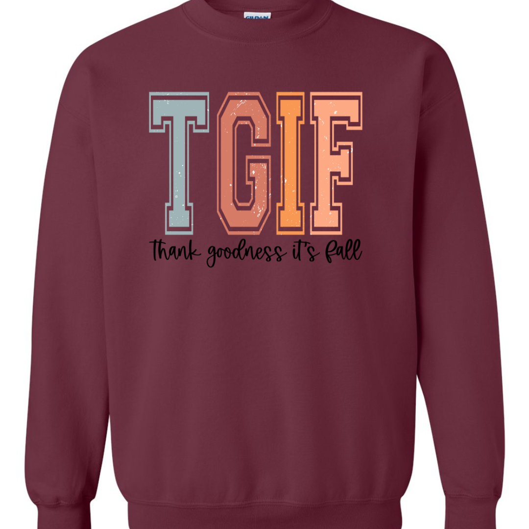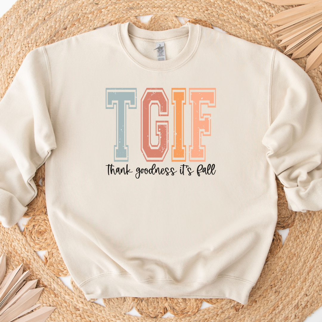 Celebrate the arrival of cozy sweaters, pumpkin spice everything, and the vibrant colors of autumn with our "TGIF: Thank Goodness It's Fall" sweatshirt. πŸβ˜•πŸ§₯