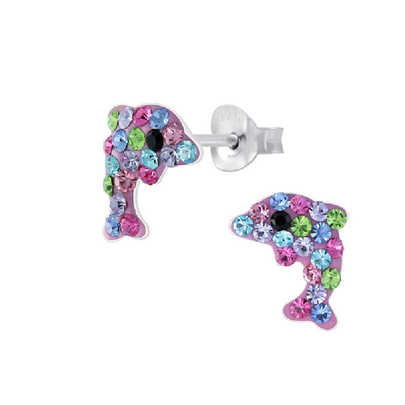 Multicolored Rhinestone Dolphin Sterling Silver Stud Earrings