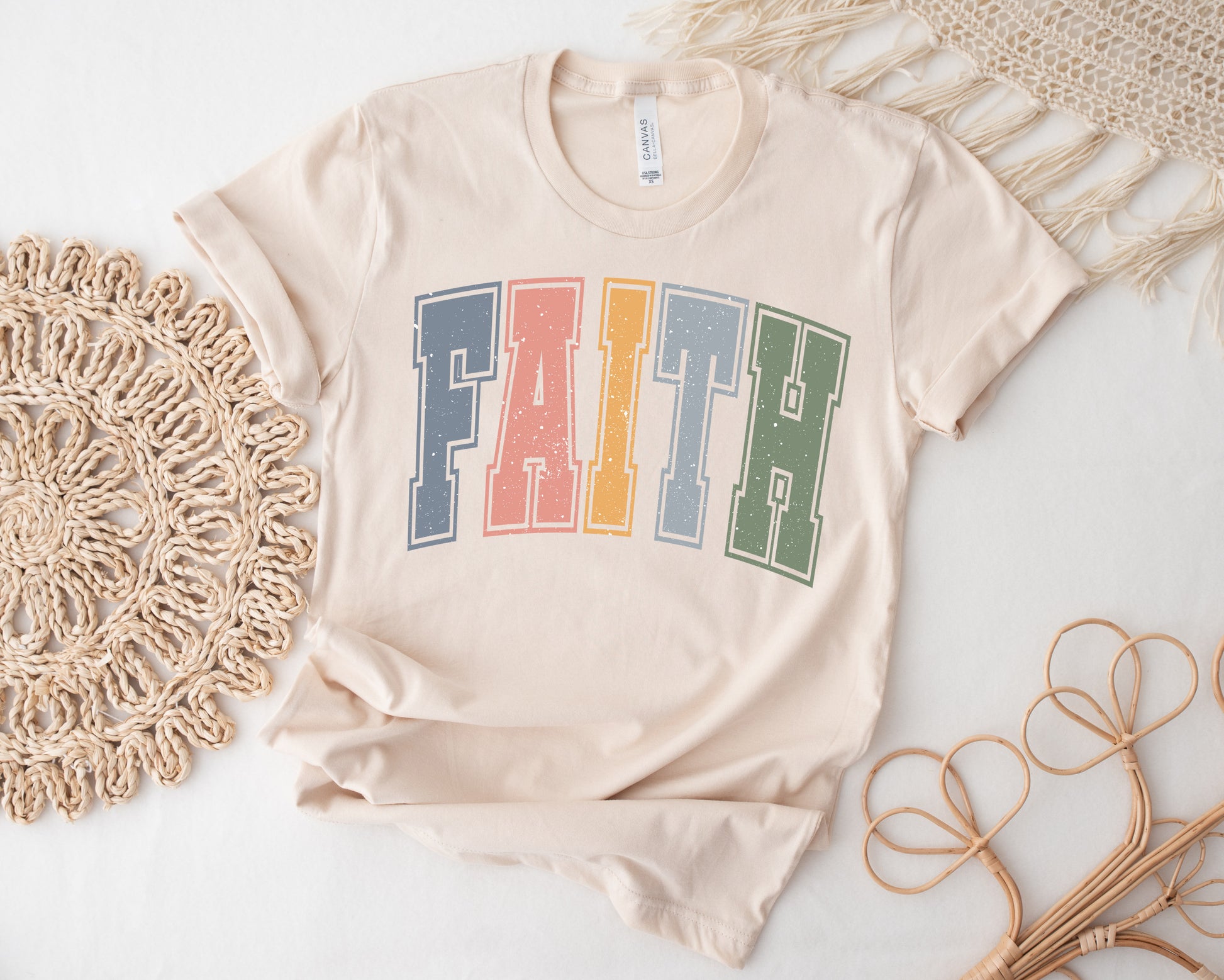 Spread some faith and fun with our Faith Colorful Tshirt! Made with super soft fabric, this tee is perfect for everyday wear. Its pastel colors make it ideal for Easter or any day. Show off your playful side and have a little faith in our quirky and comfy shirt!