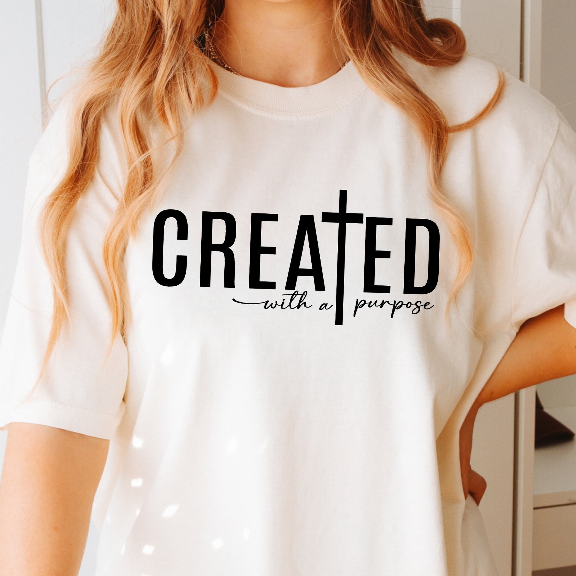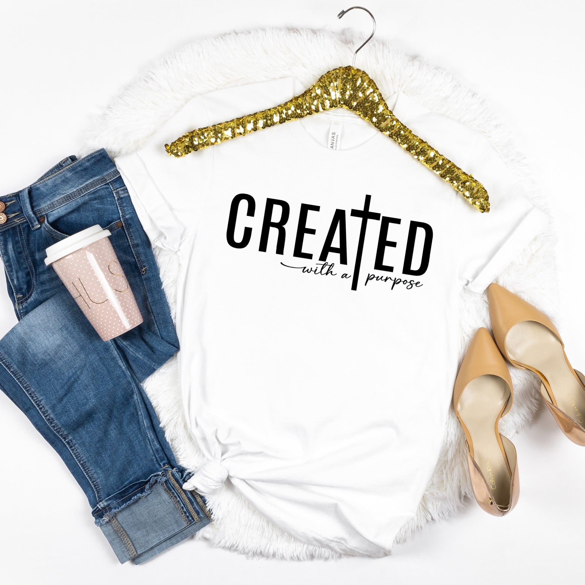 "Get ready to wear your faith with our Created with a Purpose Religious Tshirt. Featuring a stylish cross, this tee is a reminder that you were made for a purpose. Perfect for those who love to show off their belief (and look good doing it)!