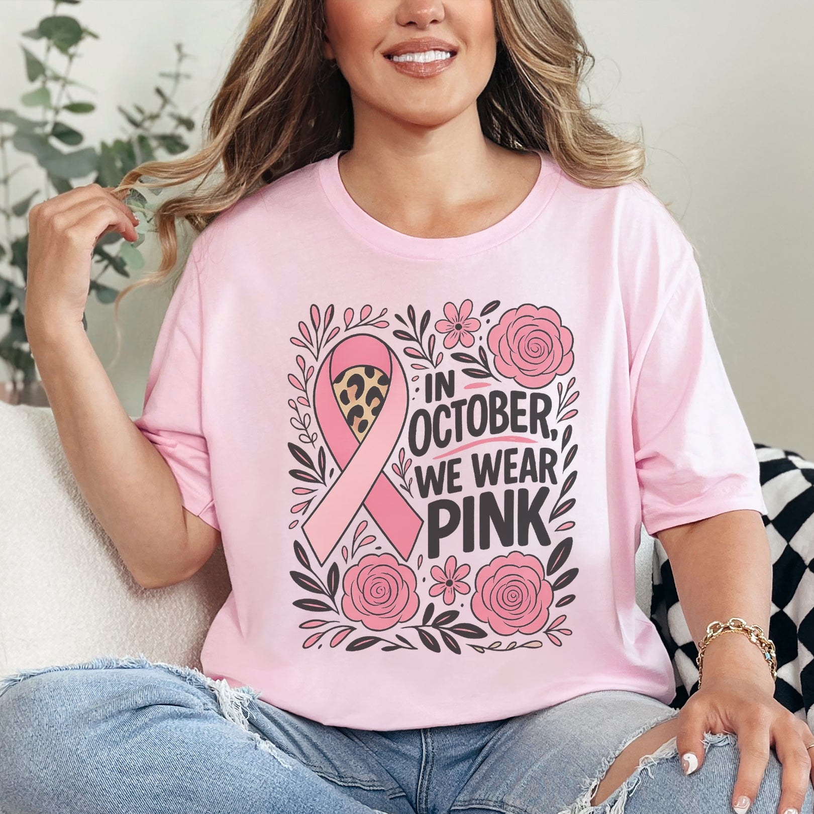 Show your support in style with this soft pink t-shirt, designed to raise awareness, start conversations, and honor every fighter and survivor. Featuring the message "We Wear Pink in October" in elegant script surrounded by a delicate floral motif, this sweatshirt brings warmth — in more ways than one.