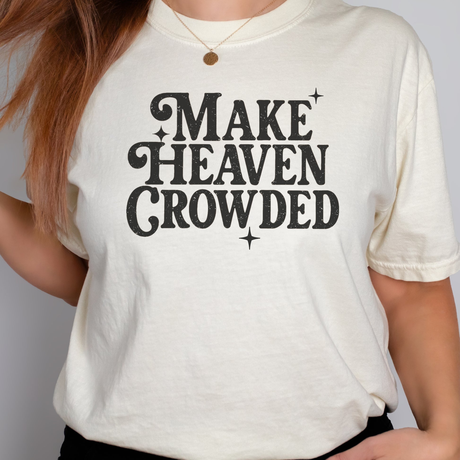 This vintage-style tee makes a bold faith statement with its distressed black lettering and retro font: Make Heaven Crowded. Whether you're at church, youth group, or running errands, it's a reminder of what matters most — and a chance to spark something bigger.