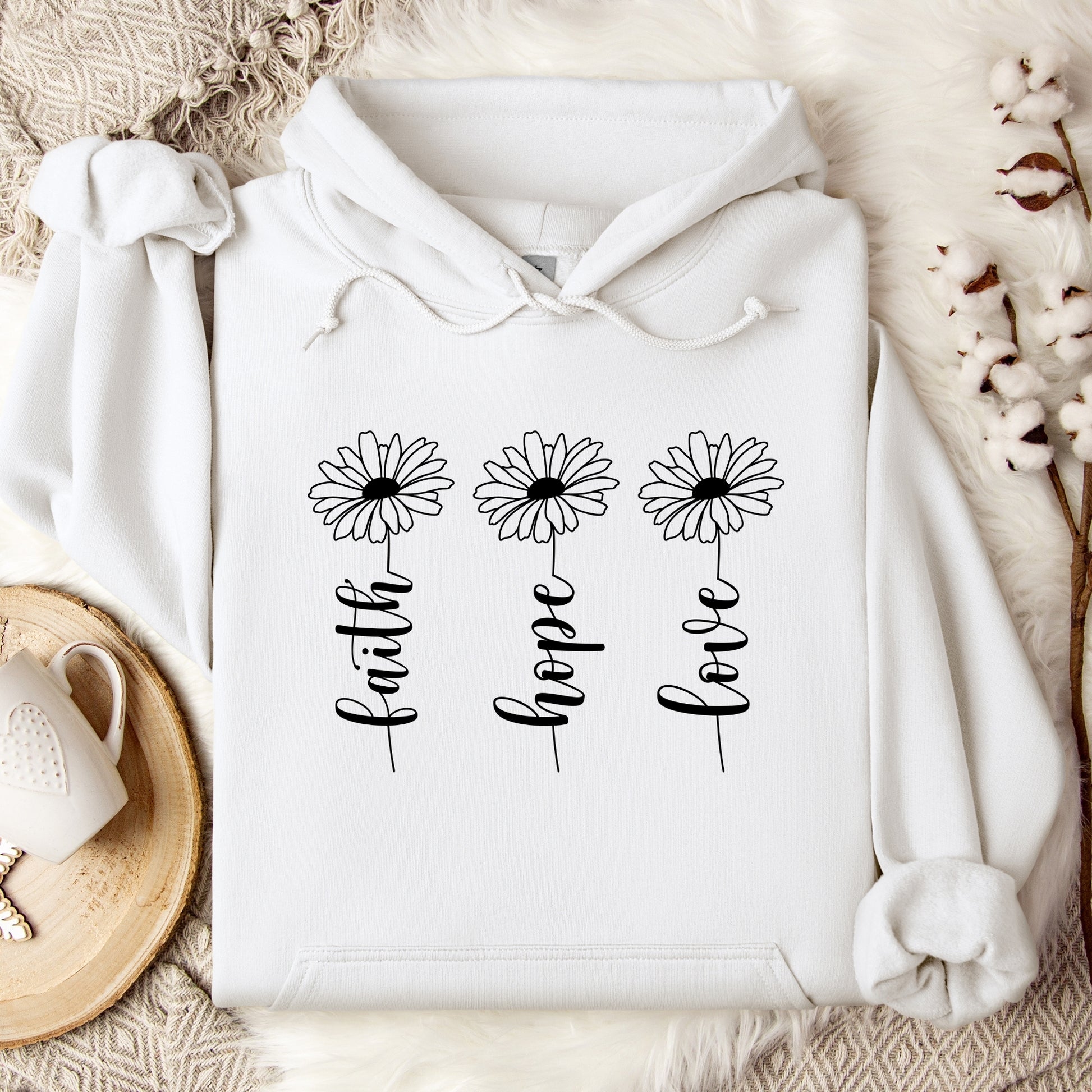 Show your faith in style with this Faith Hope Love hoodie, featuring a charming floral design. Cozy and soft, it’s perfect for spreading positivity and warmth wherever you go. Whether you’re relaxing at home or out with friends, this sweatshirt reminds you to wear your heart—and your faith—on your sleeve.