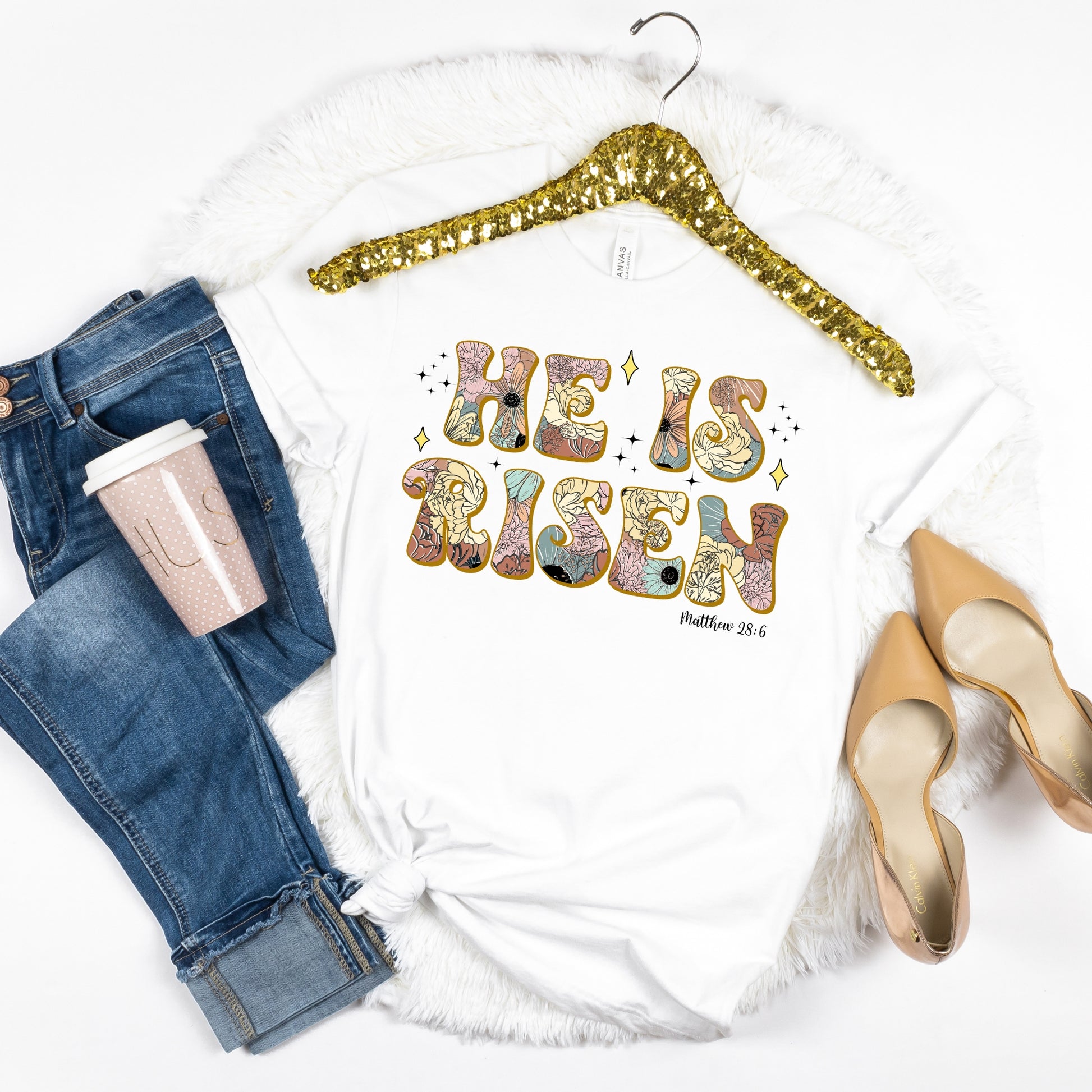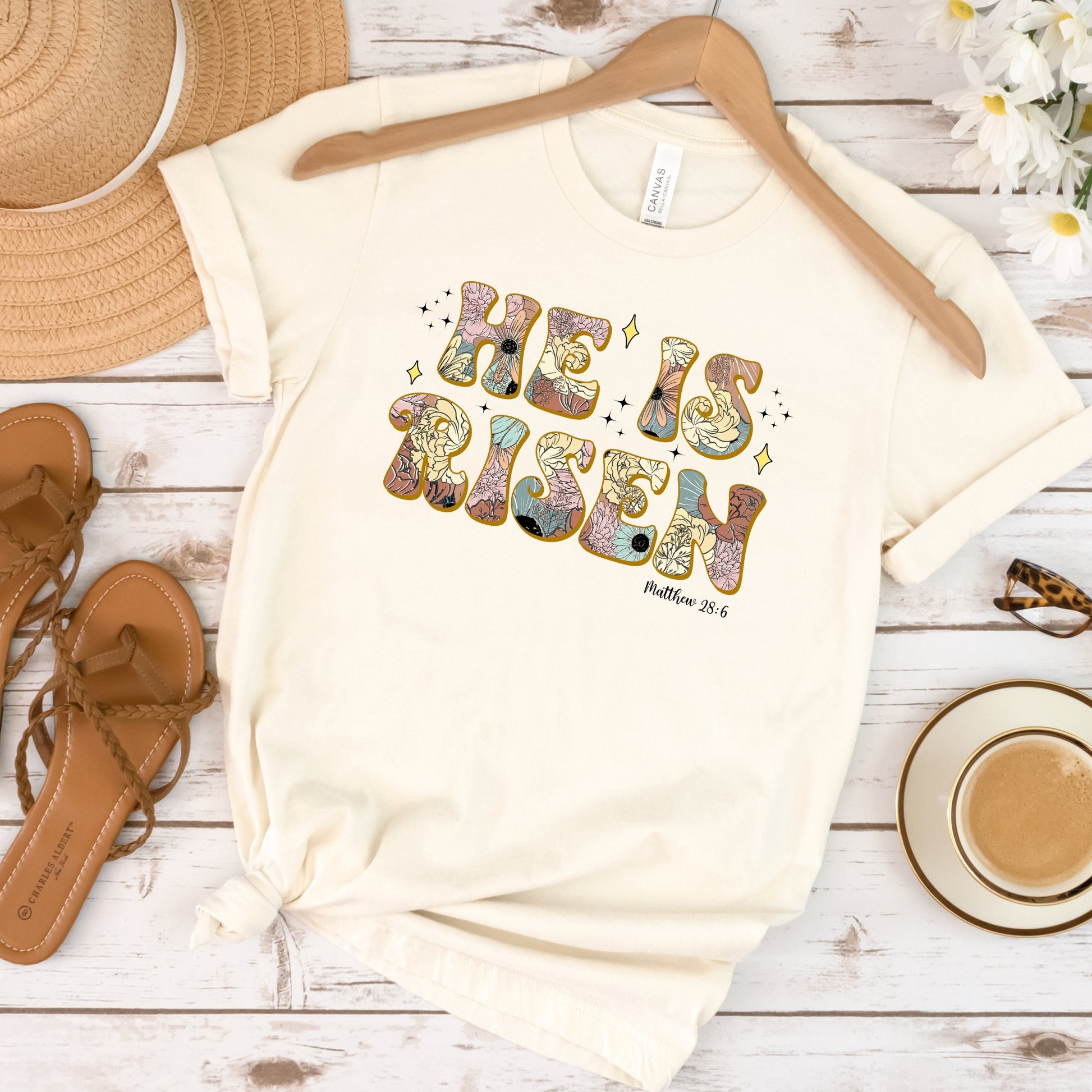 Celebrate year-round with our He is Risen floral graphic tee. Perfect for Easter and beyond!