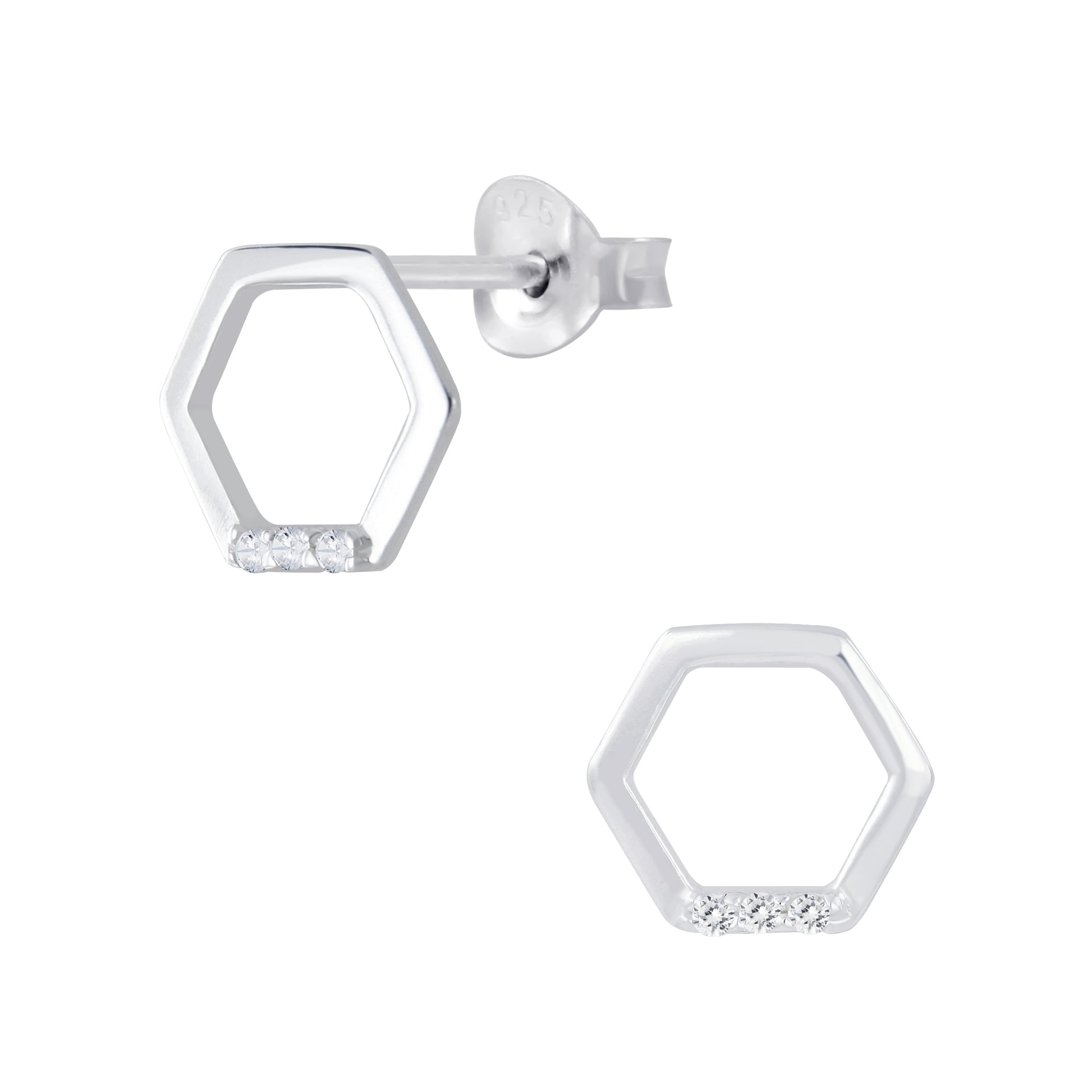 Indulge in the elegance and charm of our Hexagon Sterling Silver Heart Stud Earrings. These beautiful earrings feature a unique hexagon shape in sterling silver, adorned with sparkling rhinestones on the bottom. Perfect for adding a touch of glamour to any outfit, these tiny earrings are a must-have for every jewelry collection.