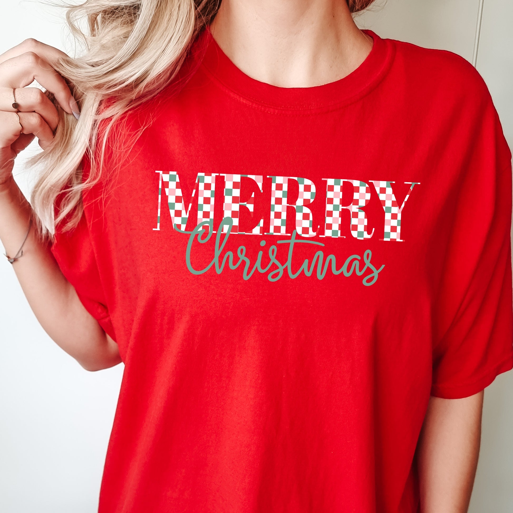 Spread holiday cheer with this unique Merry Christmas Checkered Tshirt. With its one of a kind design, you'll stand out from the crowd and bring smiles to everyone's faces. 'Tis the season to be jolly, so why not do it in style?!