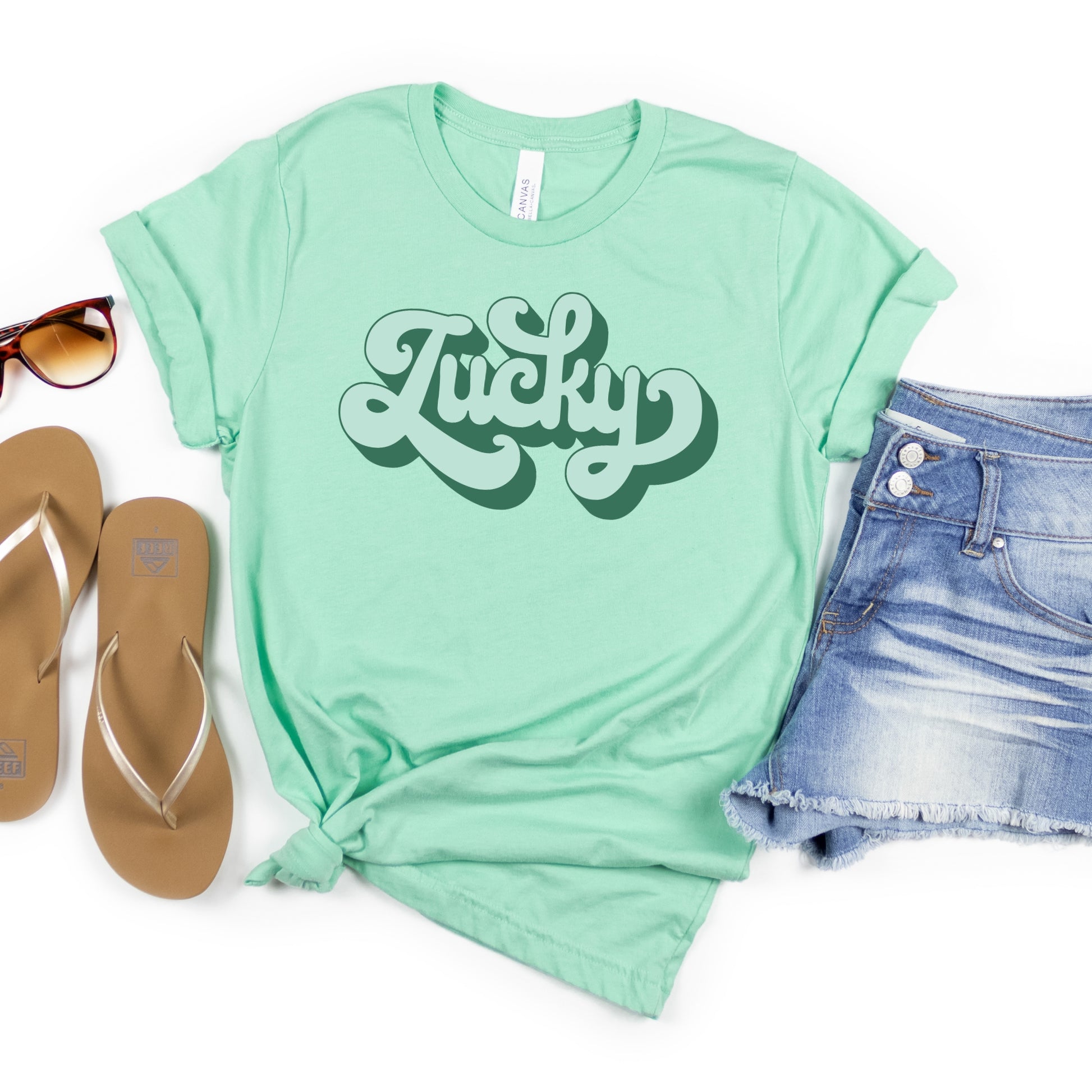 Get lucky this Saint Patrick's Day with our Lucky Tshirt! Available in classic green or a soft mint color, this shirt will make sure you stand out in the crowd. Perfect for celebrating with friends and family. Don't wait, get your lucky shirt now!