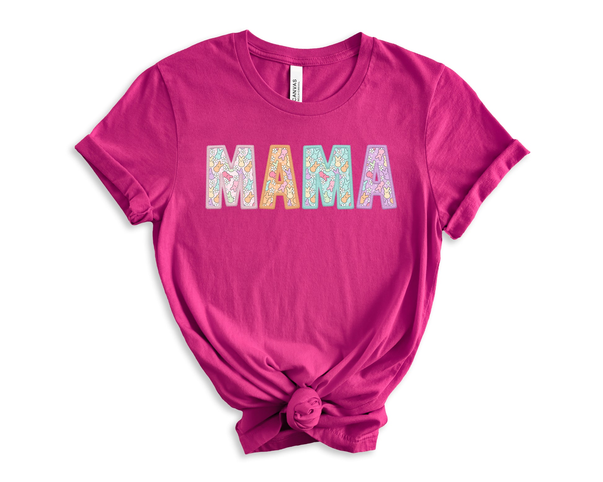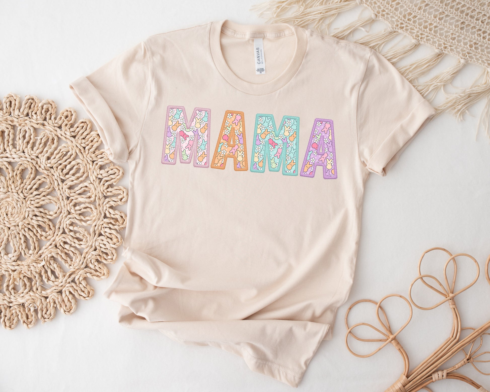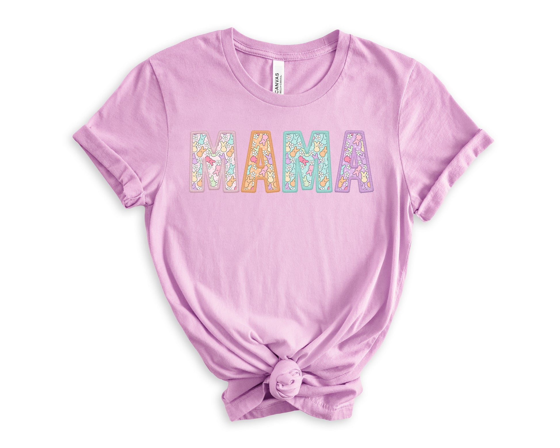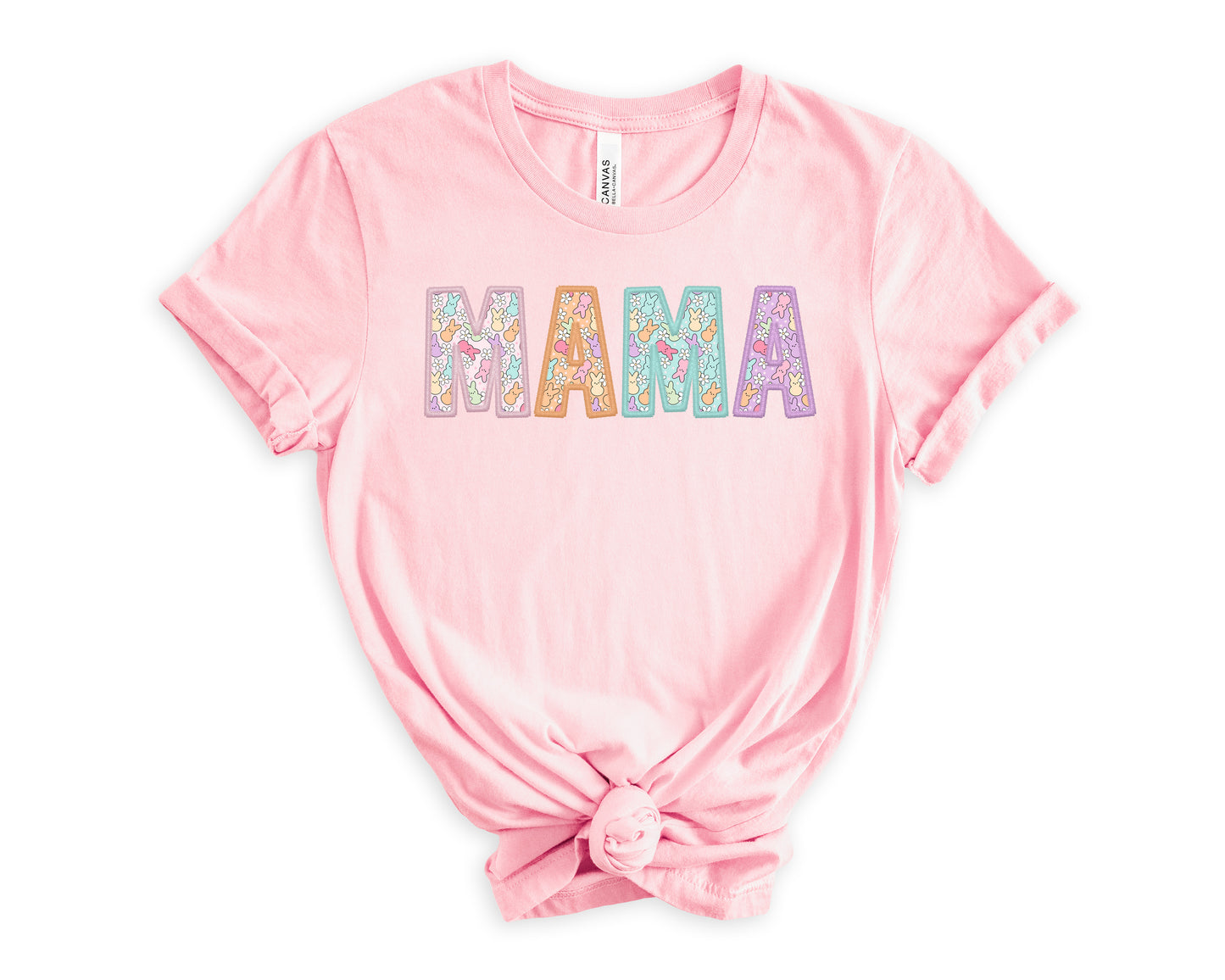 Celebrate Easter in style with this Mama Peeps Women's Graphic Tshirt. The shirt features a cute little peep bunny design on the letters, in pastel colors, perfect for the festive season.
