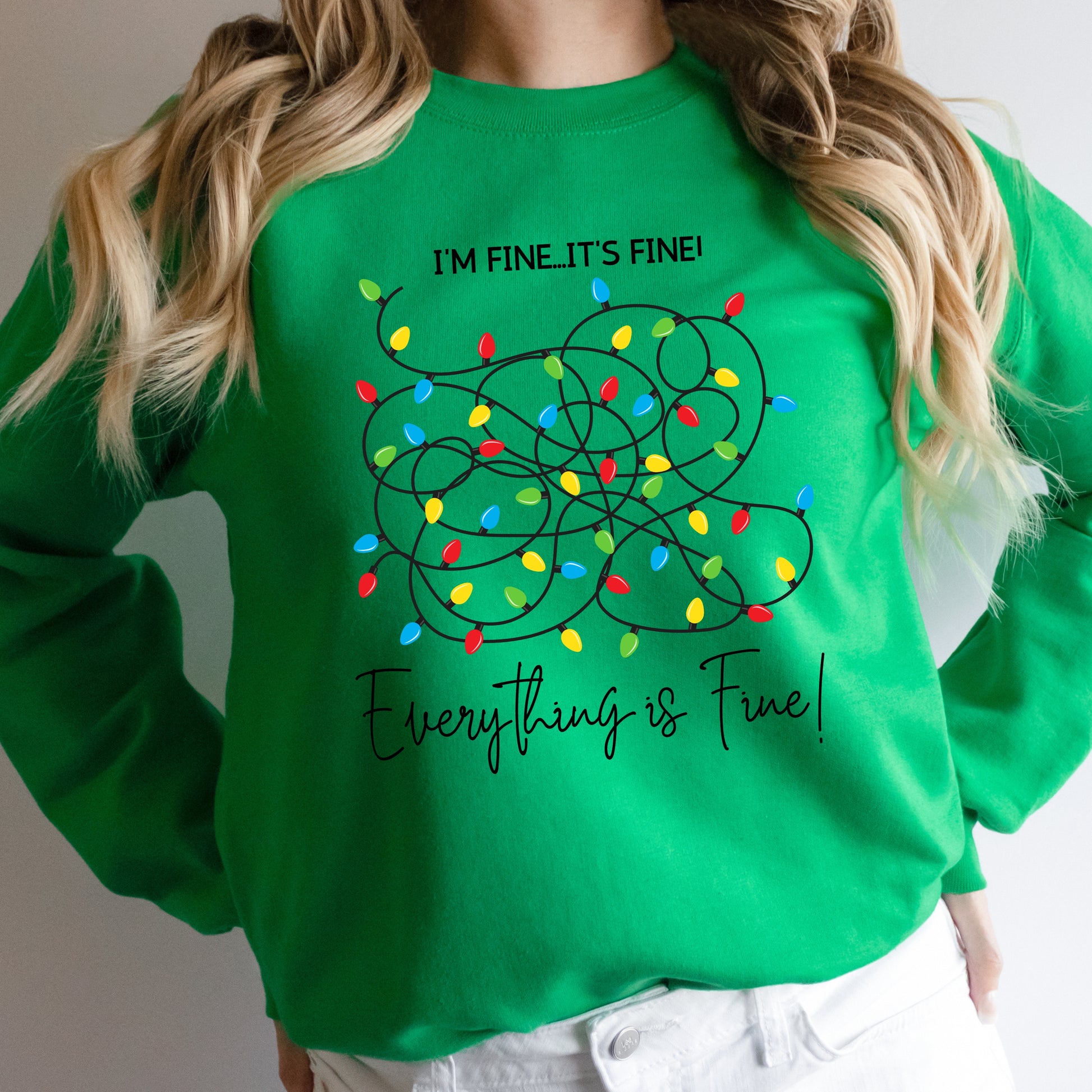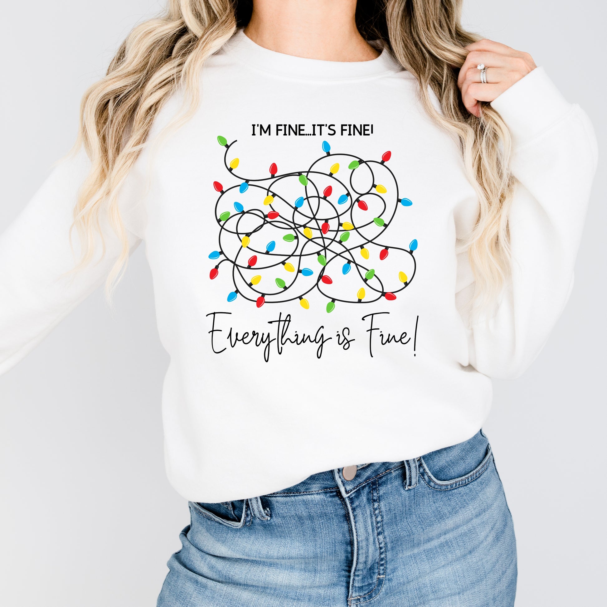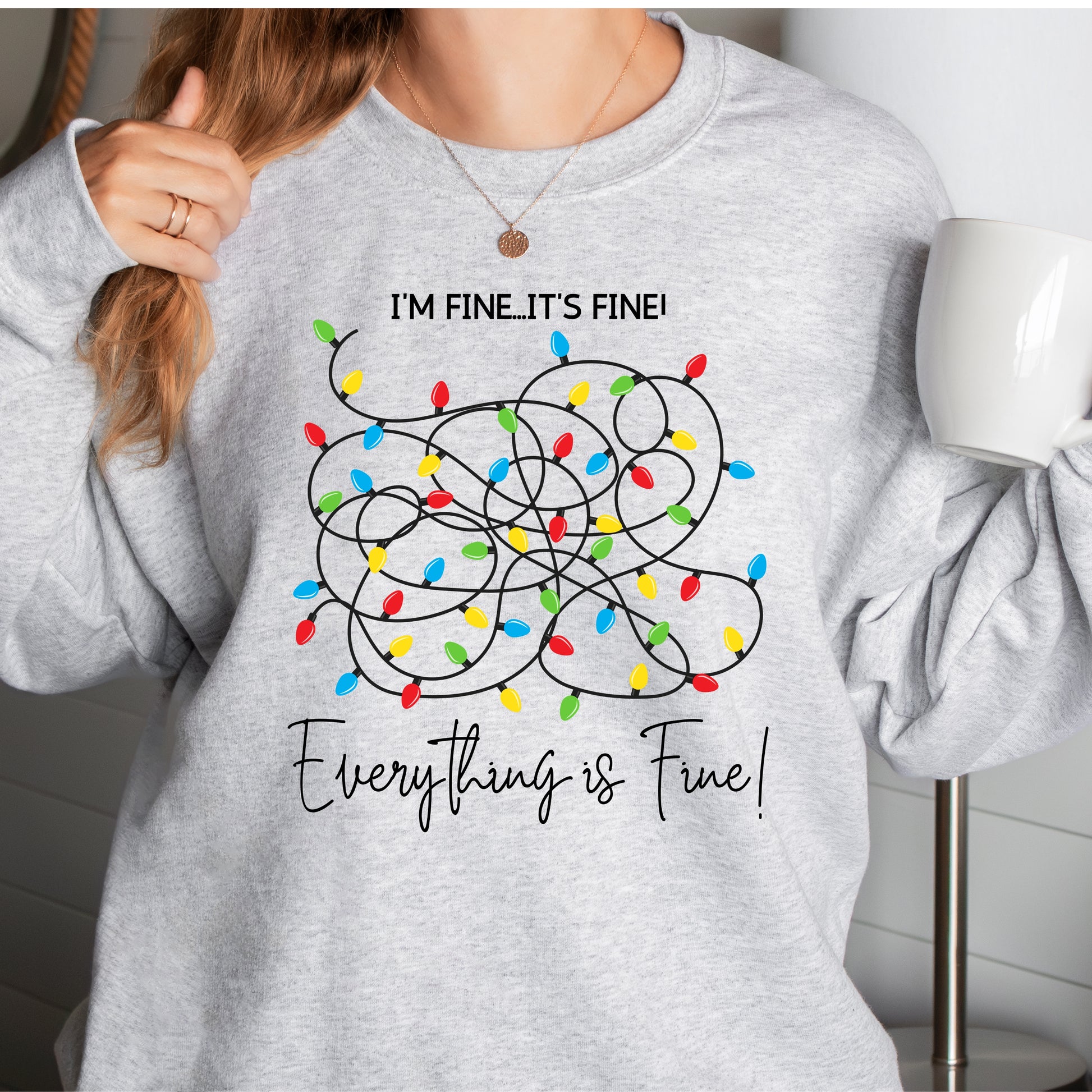 Get into the holiday spirit with a dash of humor! This cozy sweatshirt features a playful design of tangled Christmas lights with the words “I’m Fine...It’s Fine! Everything is Fine!” Perfect for anyone who can relate to the holiday chaos, this sweatshirt is both comfortable and relatable. Made from soft, high-quality fabric, it’s ideal for staying warm and stylish during the season’s festivities—or for those days when things don’t quite go as planned. Spread some laughs and keep it cozy with this festive, funny sweatshirt!