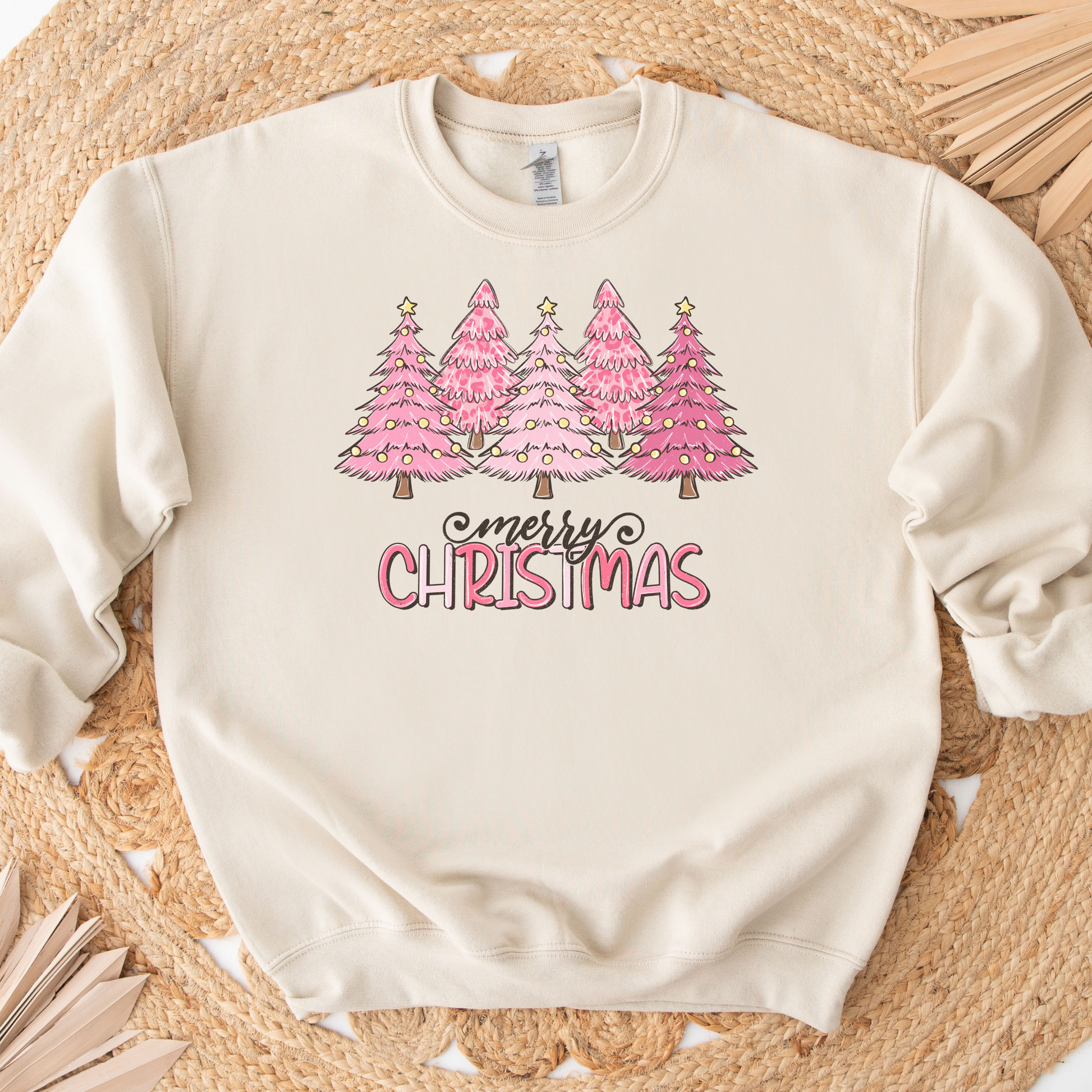 Embrace the holiday spirit with our "Merry Christmas" sweatshirt adorned with adorable pink Christmas trees on the front. The vibrant pink trees against the classic backdrop add a joyful and modern twist to your seasonal wardrobe.