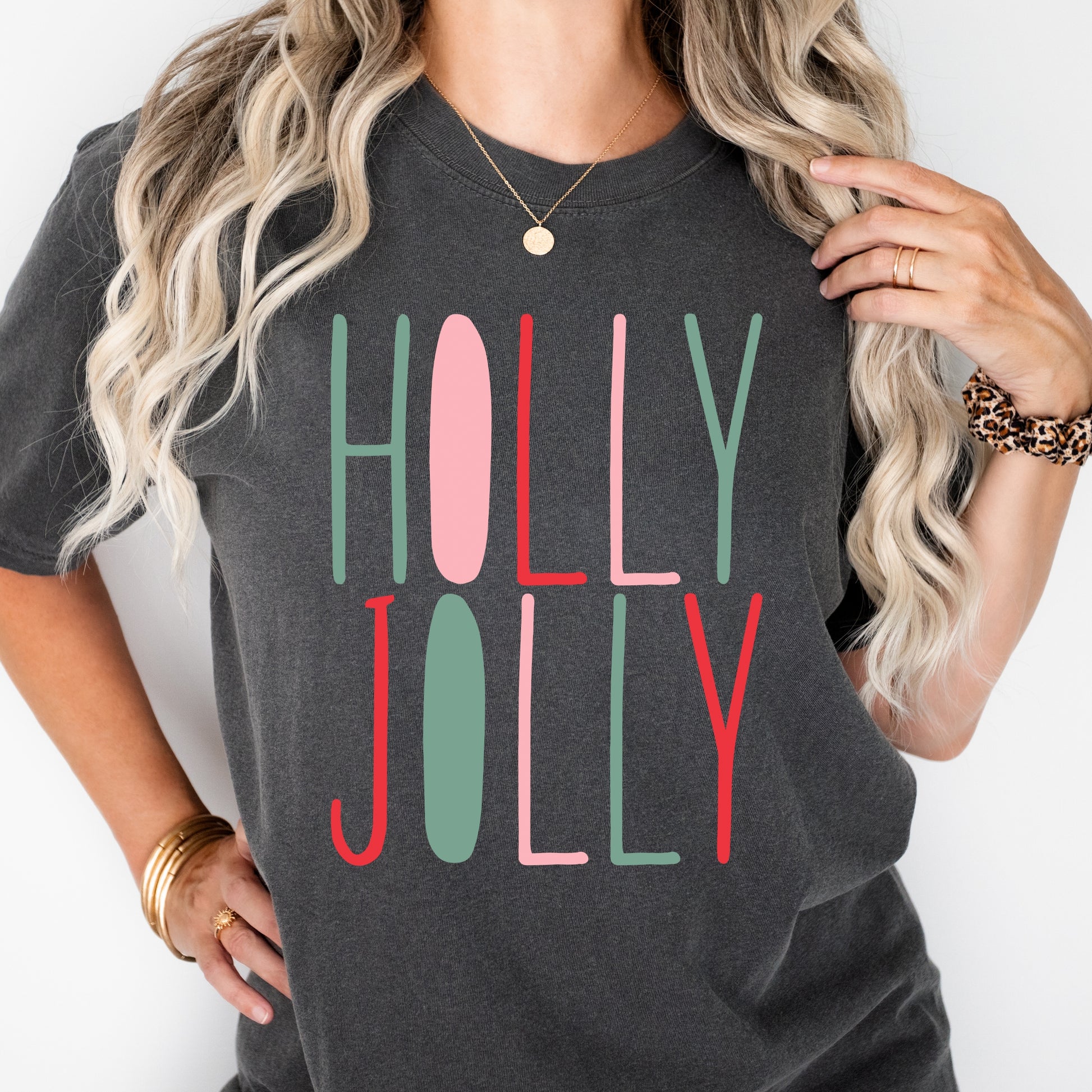 Get into the holiday spirit with our Holly Jolly Tshirt. The festive design will make you stand out at any holiday party. Spread cheer and look stylish with this unique shirt.
