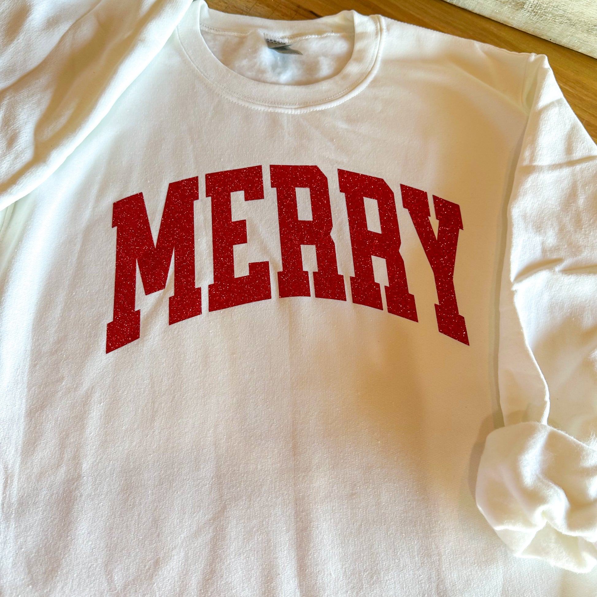 Say it loud and proud — MERRY is the vibe all season long. This crisp white crewneck features bold varsity-style red glitter lettering that adds just the right amount of holiday sparkle without going overboard.