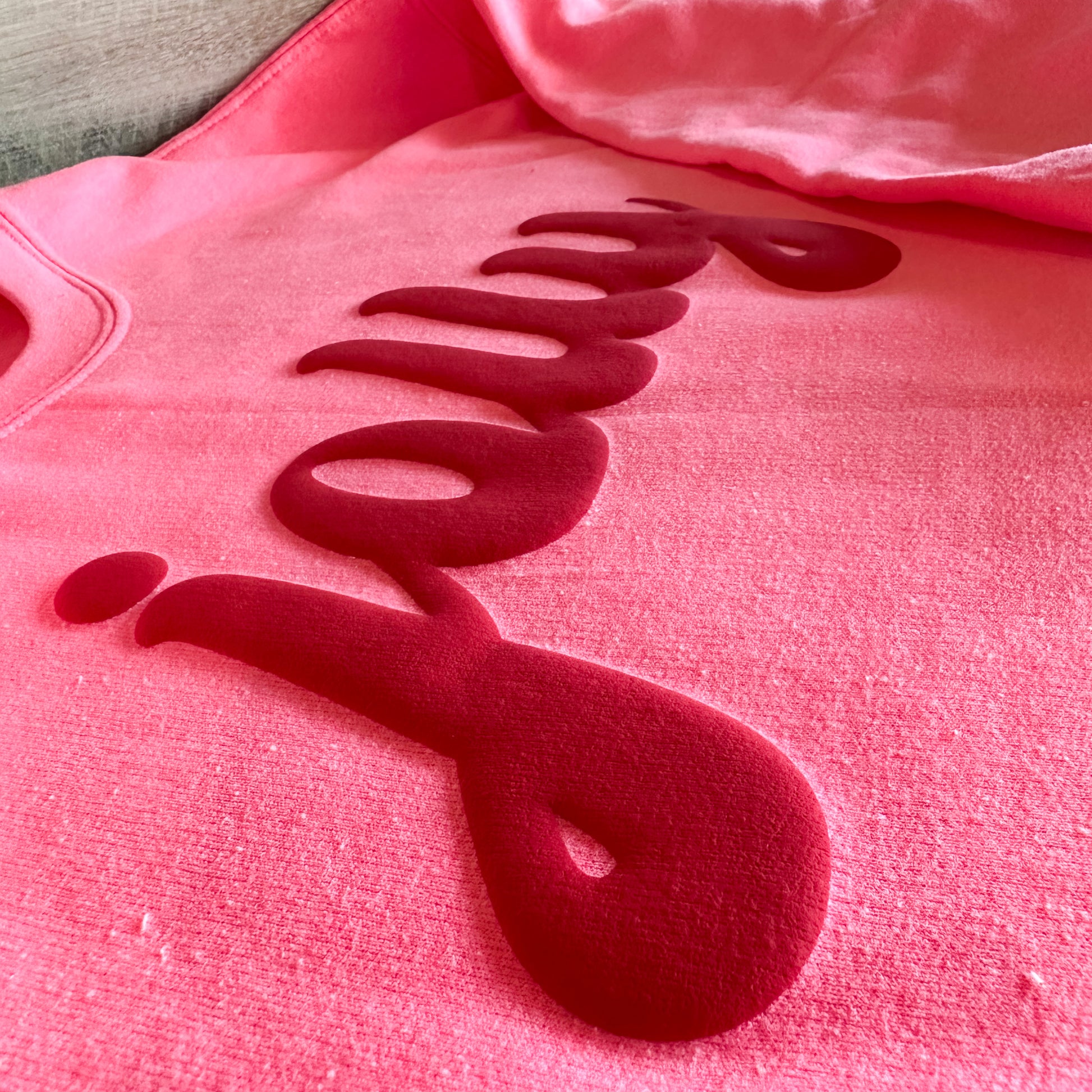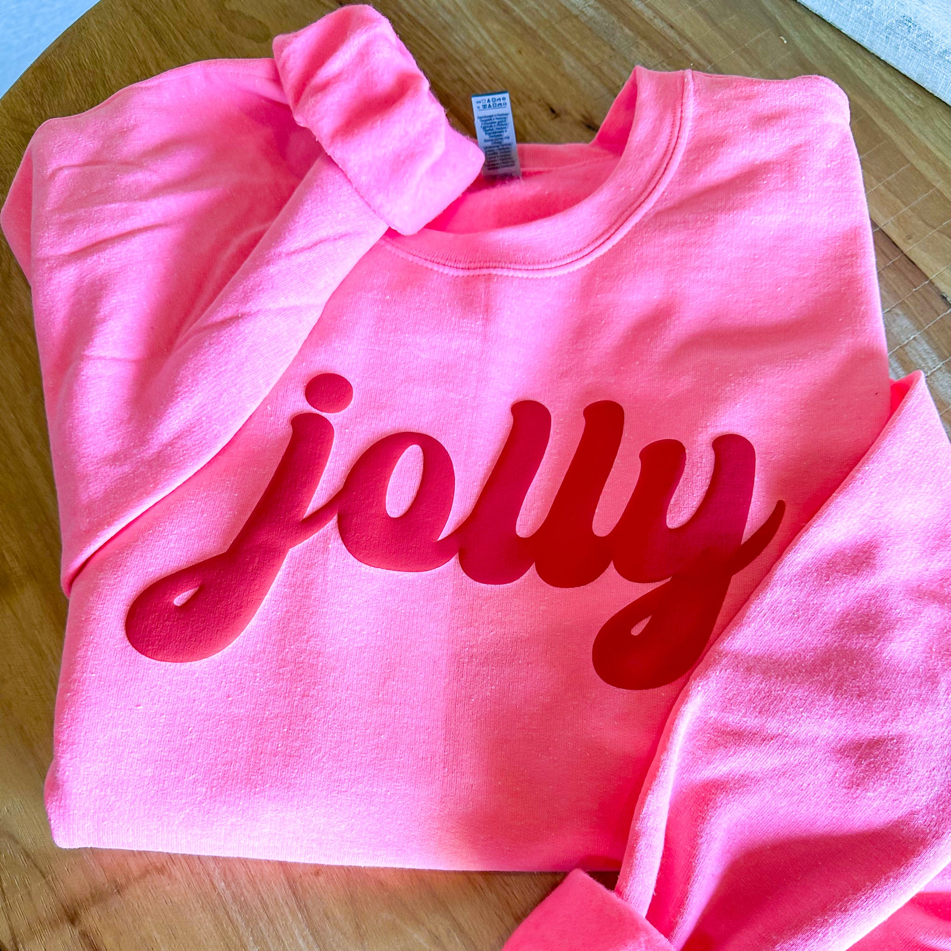 This vibrant hot pink sweatshirt is bringing main-character energy to holiday season. With a bold red puff-print “jolly” in playful script, it's equal parts cozy and cheeky — perfect for parties, selfies, or just spreading festive vibes everywhere you go.