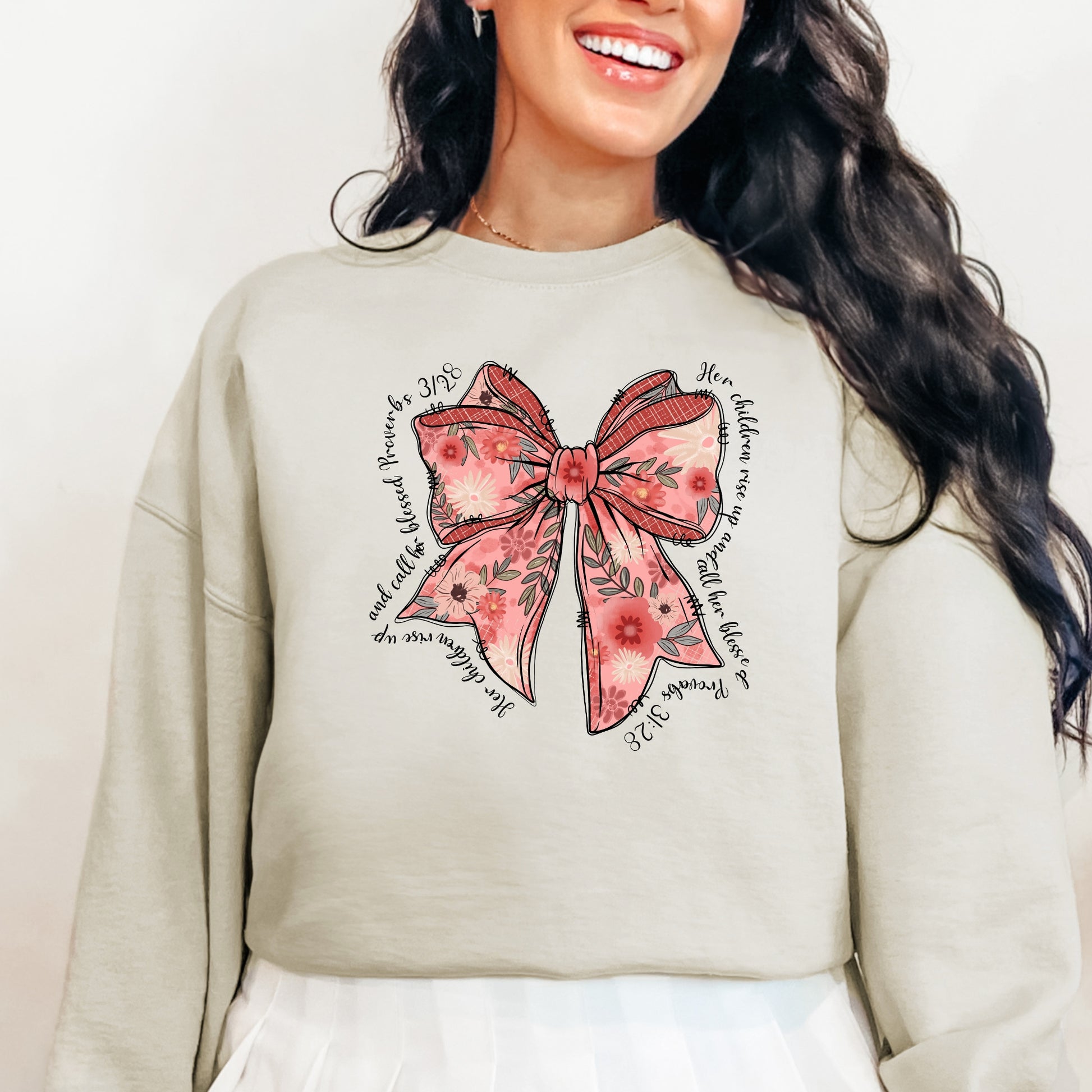 This cozy sweatshirt features a beautifully detailed floral bow with Proverbs 31:28: "Her children rise up and call her blessed." Perfect for moms, daughters, and women of faith, it’s a stylish and meaningful way to celebrate love and gratitude. Soft, comfy, and effortlessly chic!