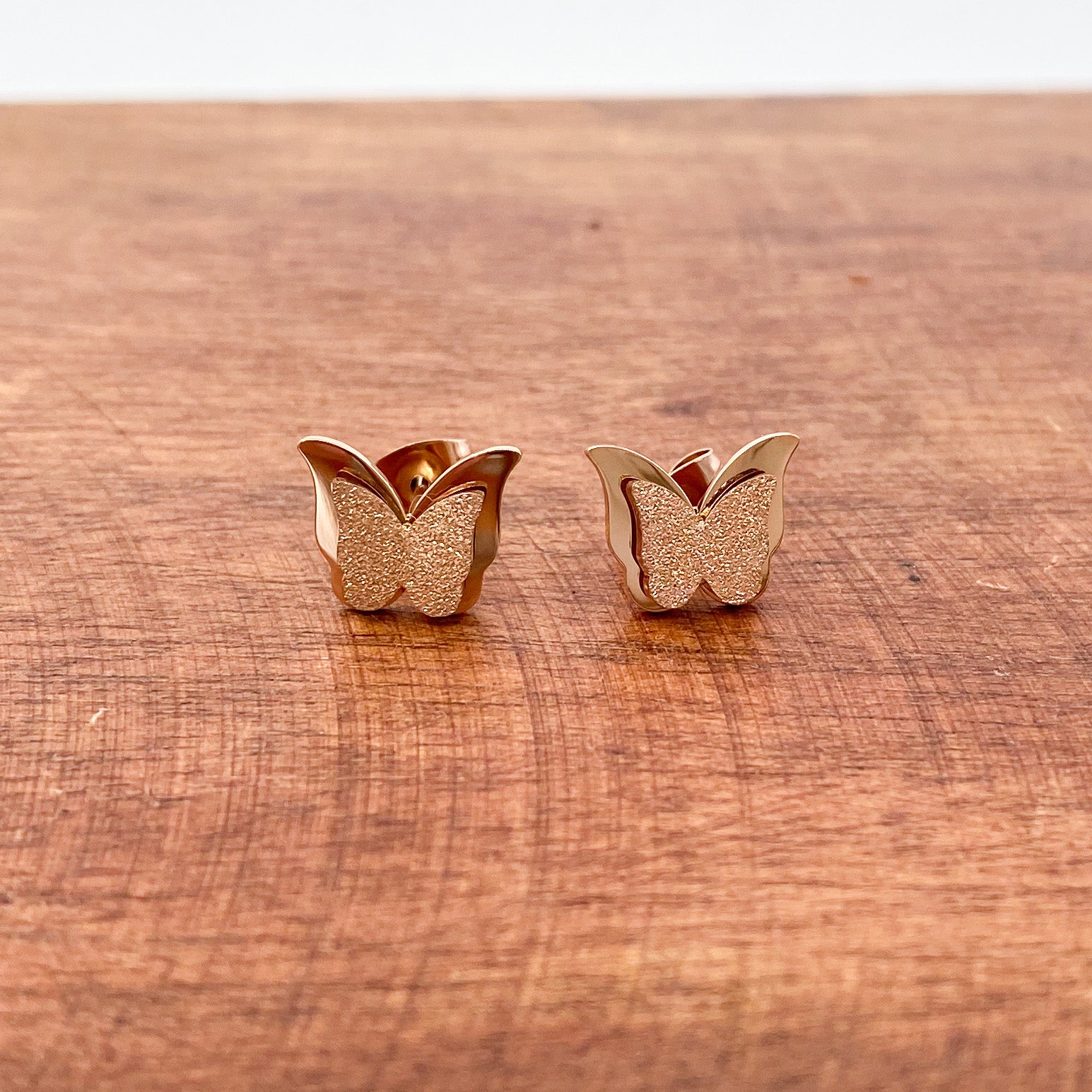Ear Post Stud Earrings Rose Gold Butterfly Animal 11mm( 3/8") x 9mm( 3/8"), Post/ Wire Size: (21 gauge), 1 Pair