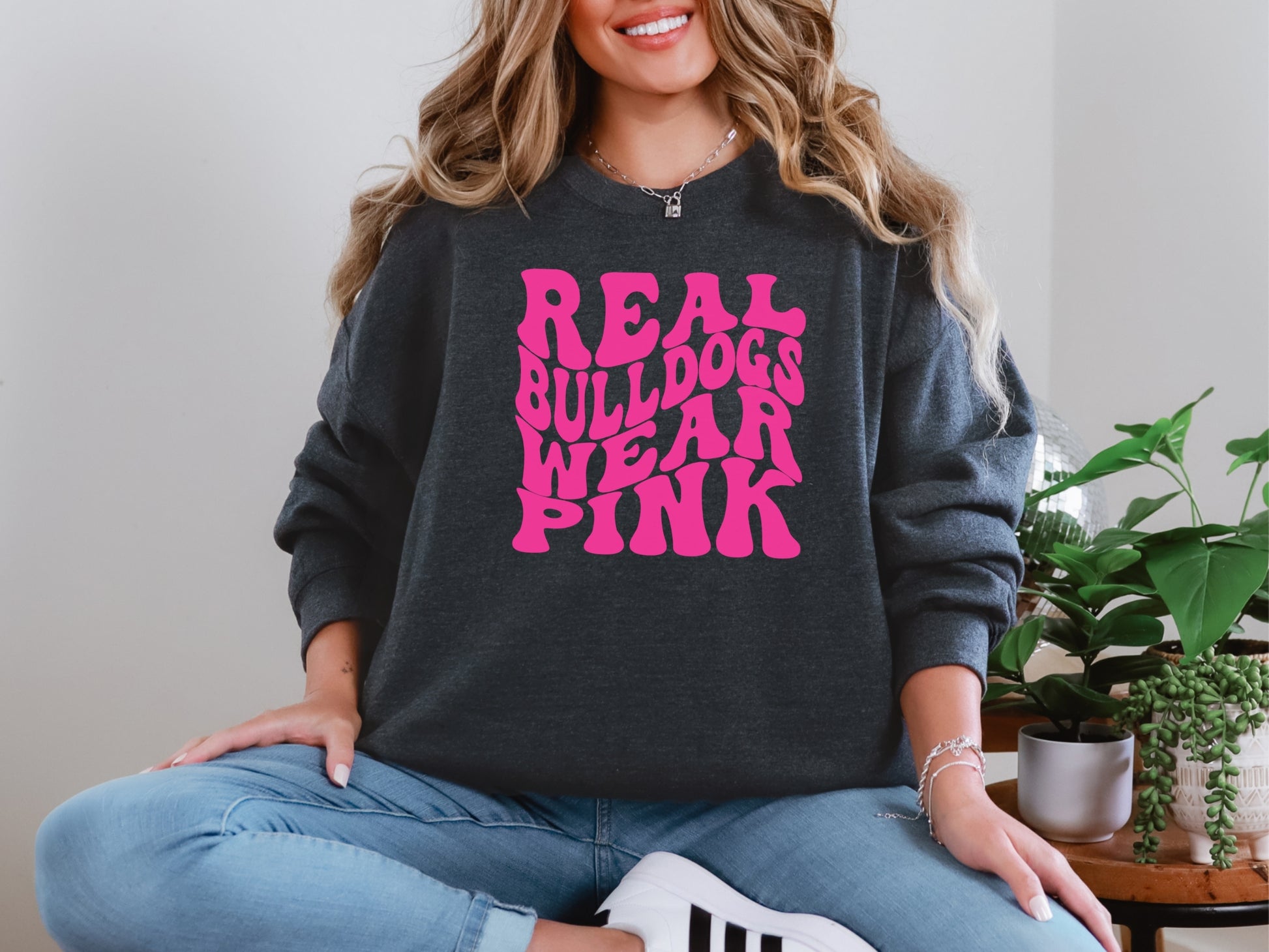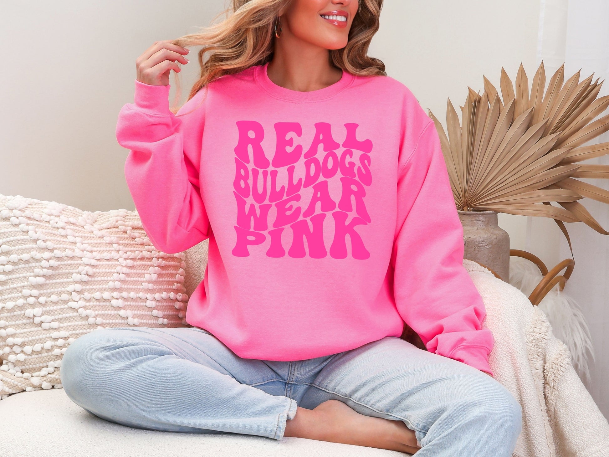 Show your bulldog pride with this fun pink sweatshirt! Featuring the playful message "Real Bulldogs Wear Pink," it’s perfect for fans who want to combine love for their furry friends with a splash of bright, cheerful style. Cozy and eye-catching, this sweatshirt makes a great casual statement while keeping you comfy all day long.