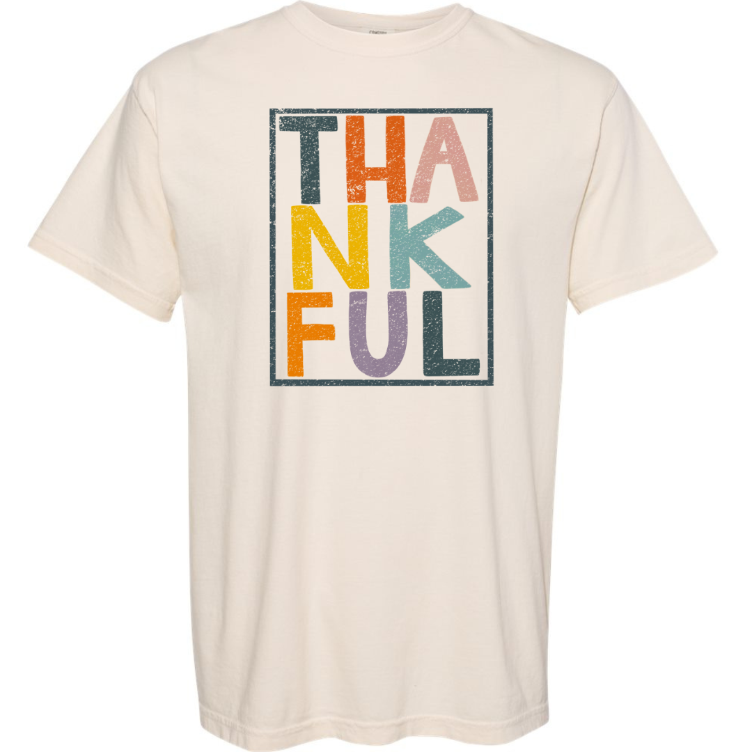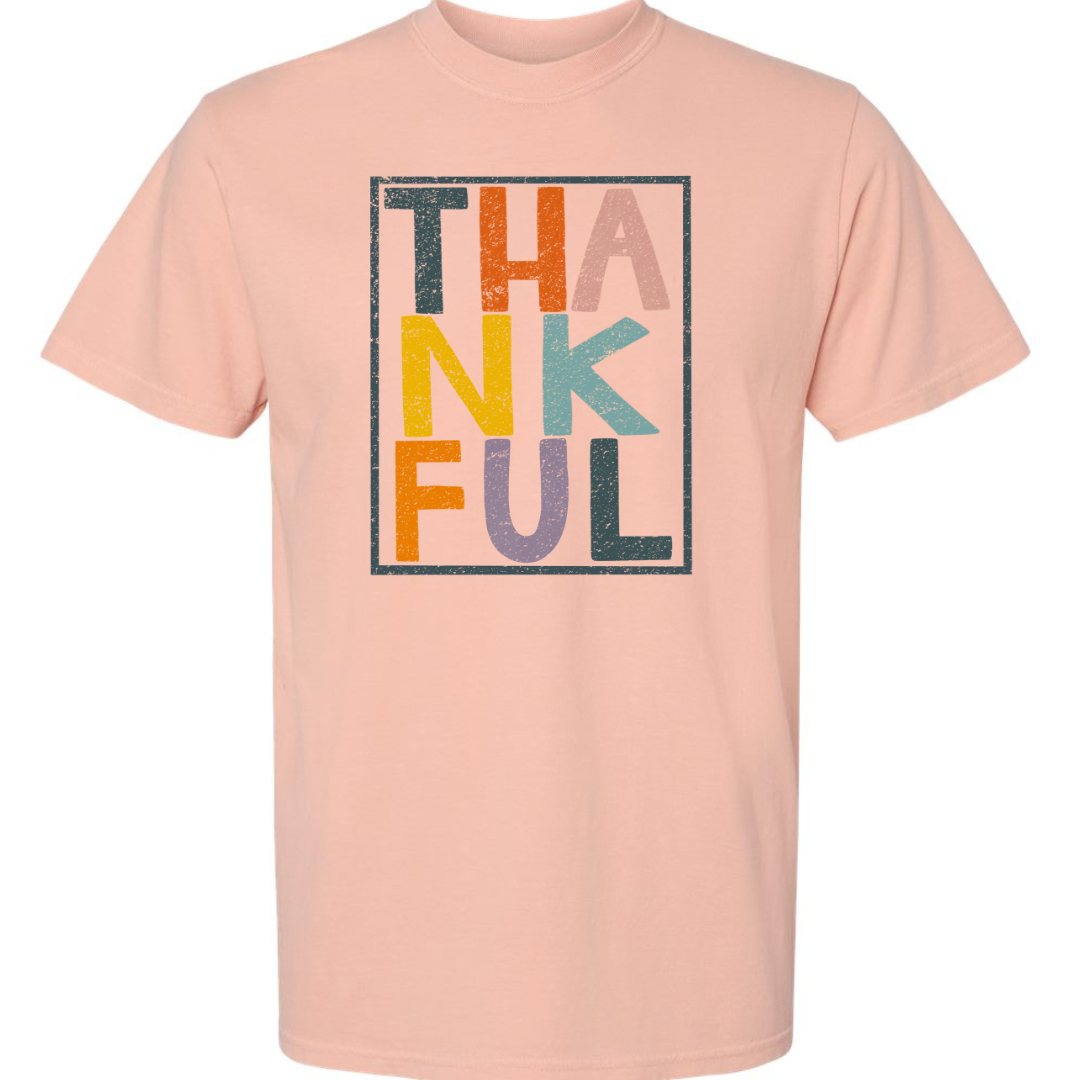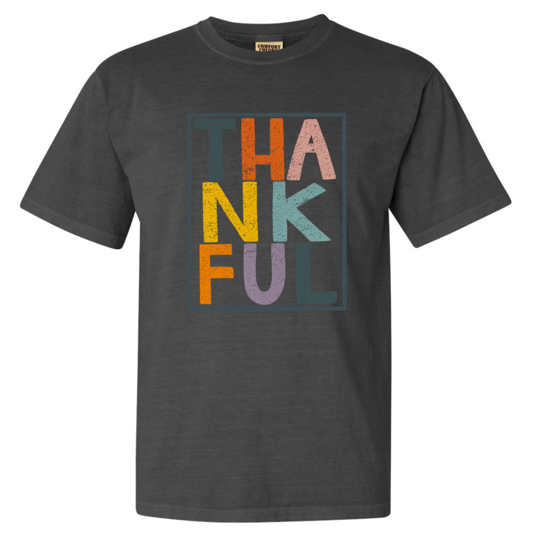 This shirt features the word 'Thankful' creatively arranged in three rows, each row in a different color.Β