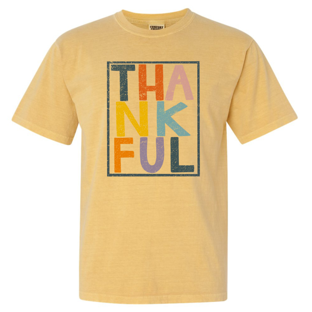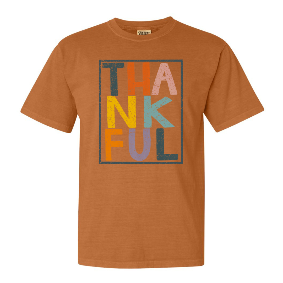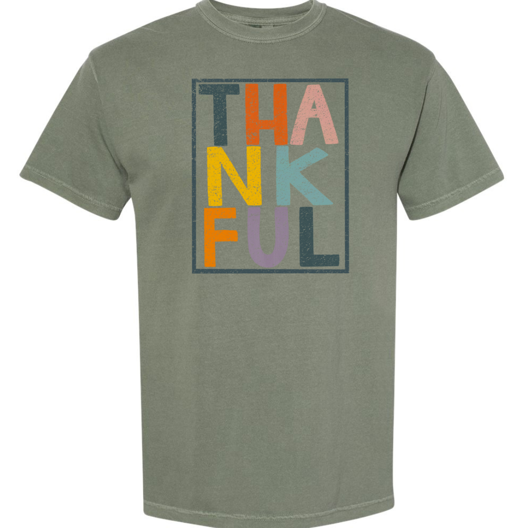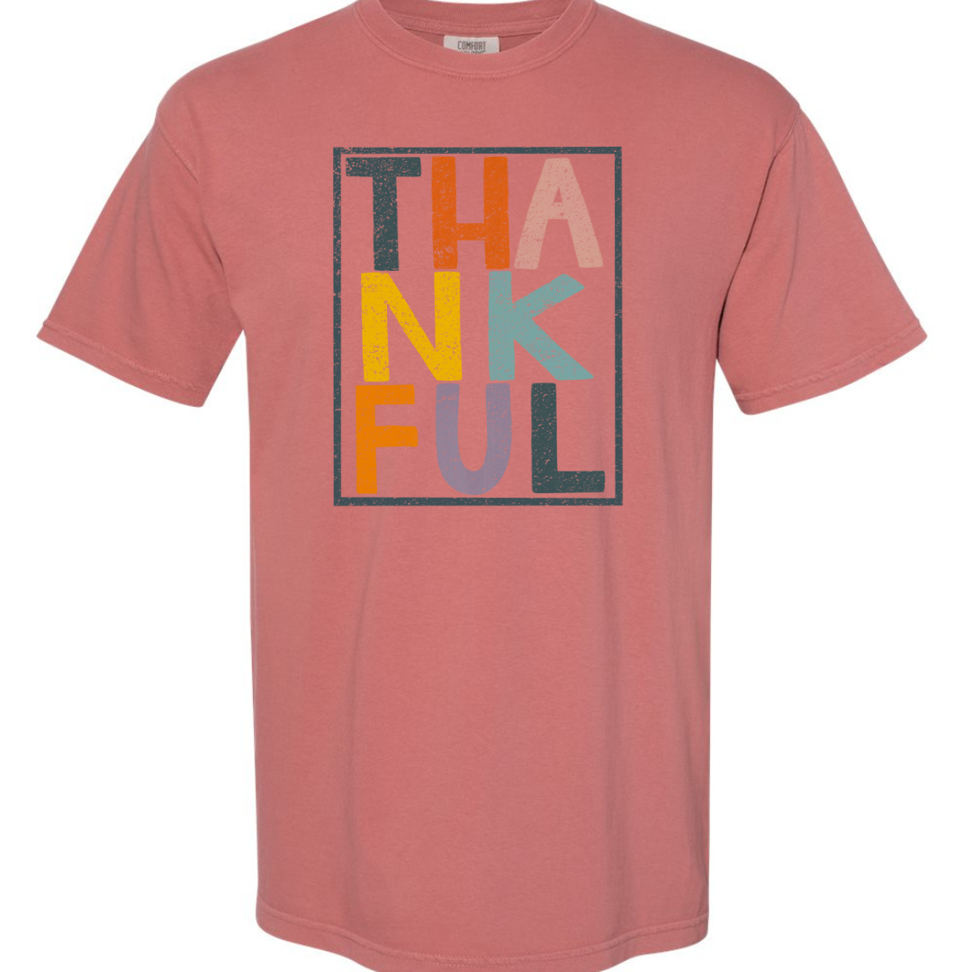 This shirt features the word 'Thankful' creatively arranged in three rows, each row in a different color.Β