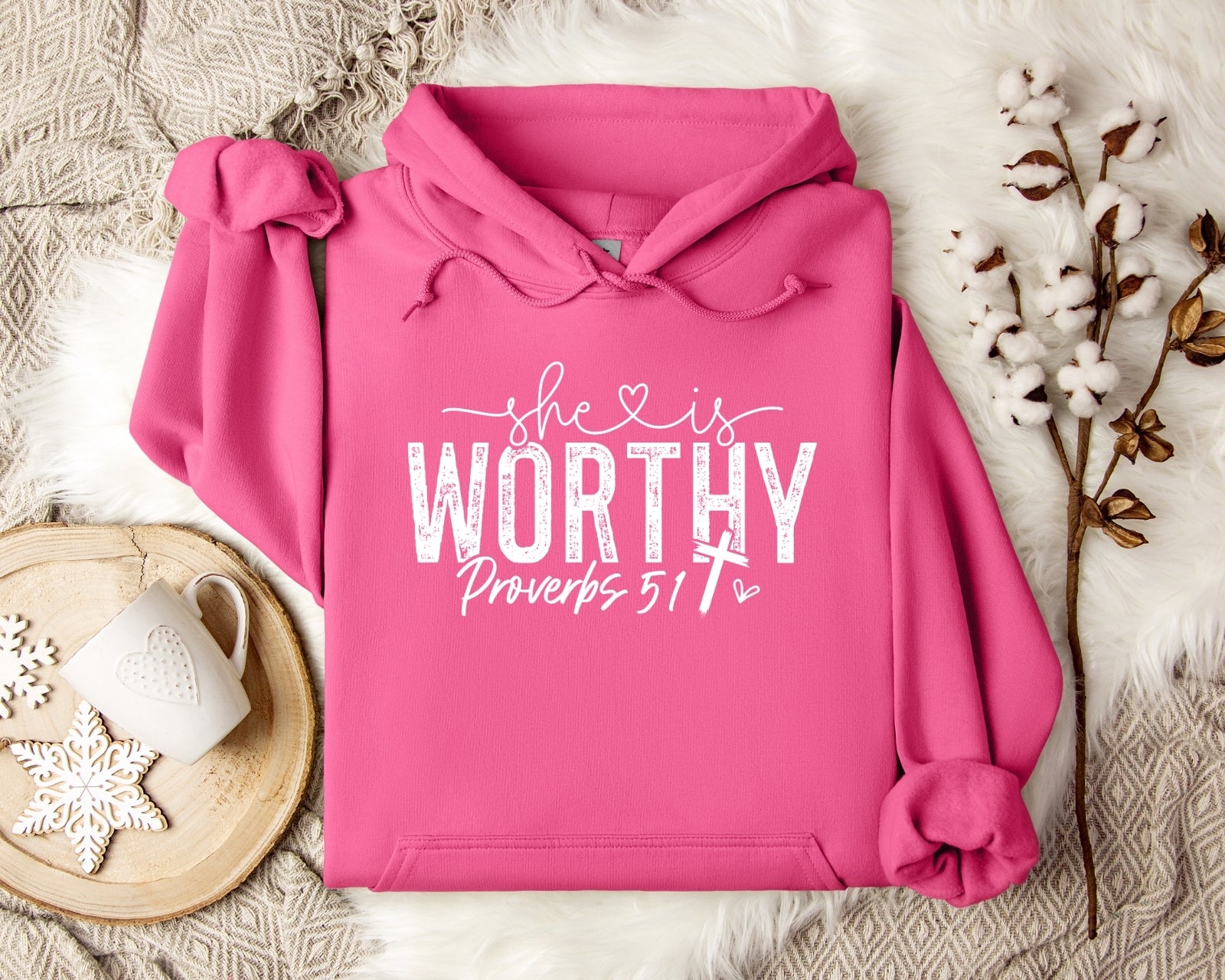She is Worthy Religious Bible Verse Hooded Sweatshirt White Writing