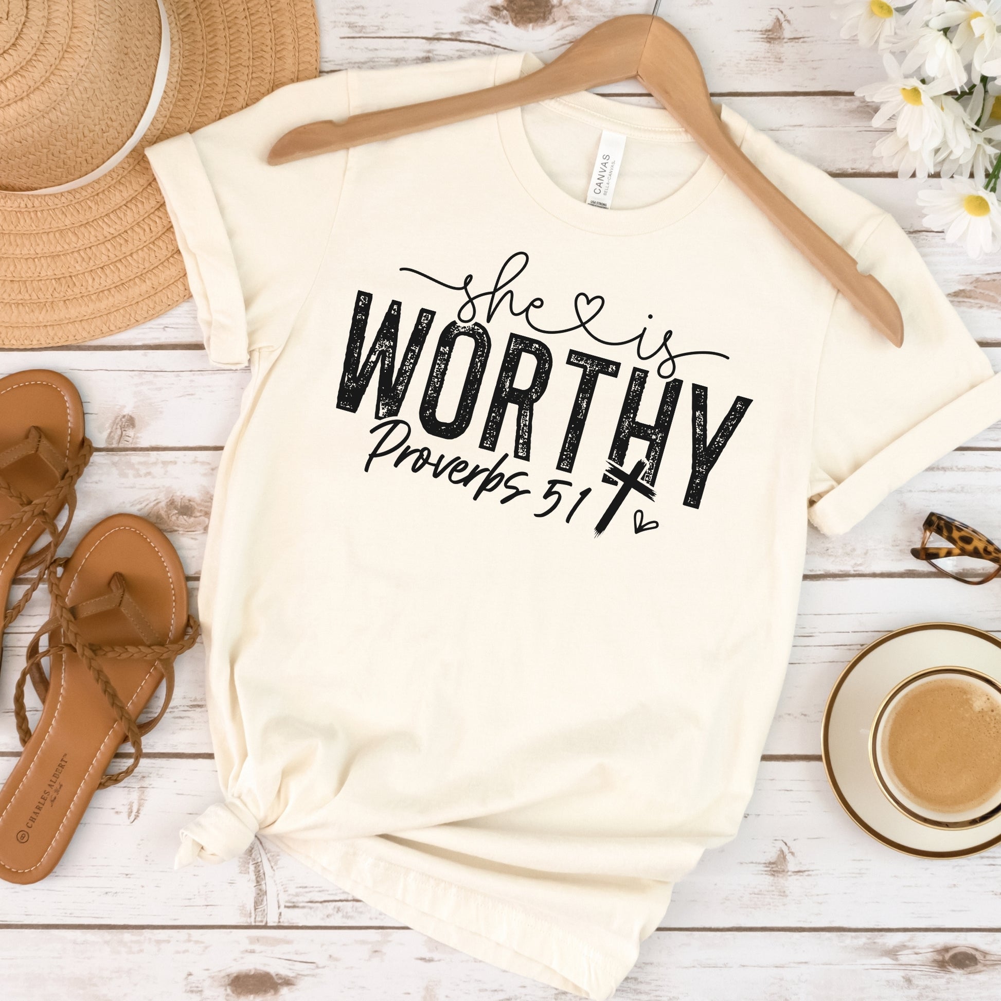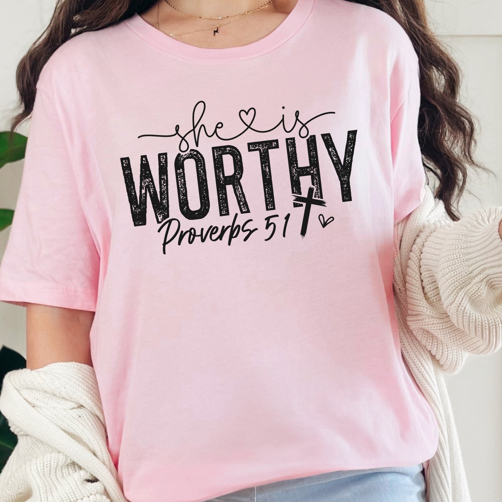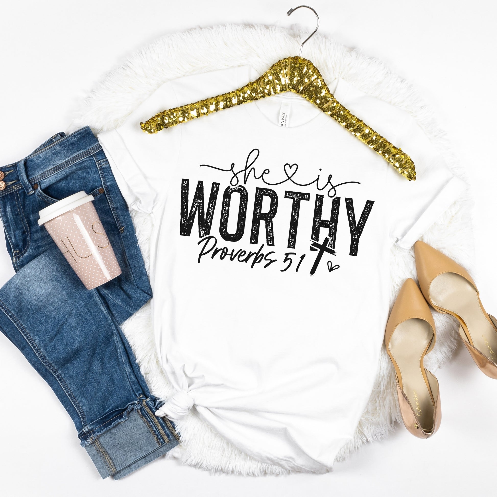 Bring faith to your wardrobe with the She is Worthy Religious Bible Verse T-shirt. This playful tee offers a comfortable fit and a meaningful message that celebrates your strength and worth. Whether you’re out with friends or enjoying a relaxed day, this T-shirt inspires confidence and joy wherever you go. Wear your faith proudly and let your spirit shine!