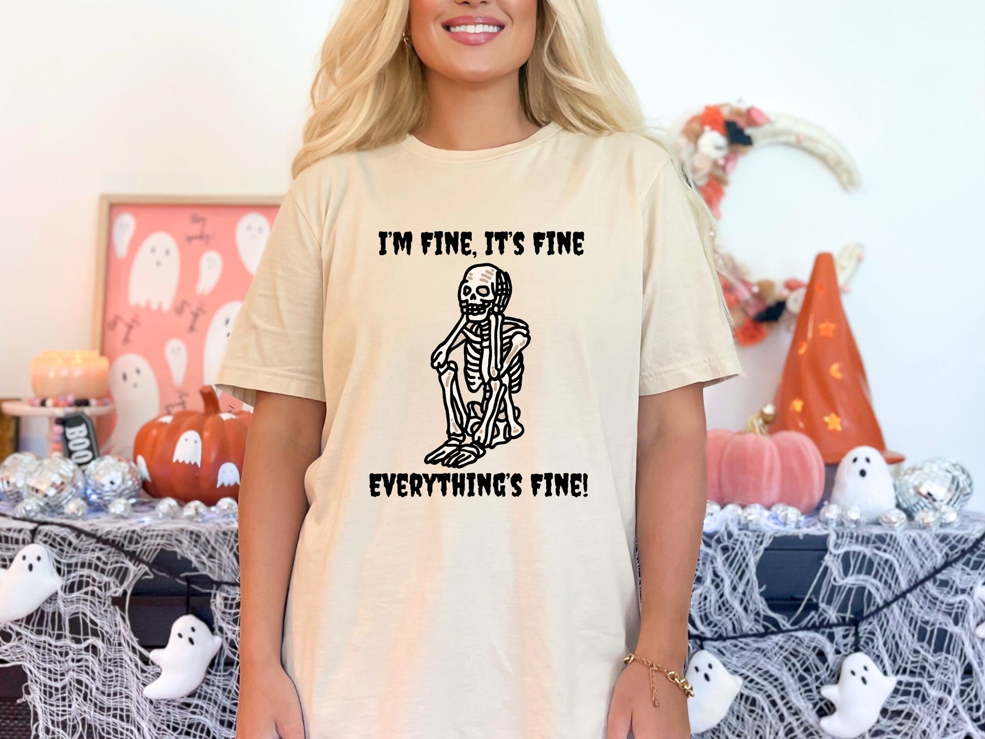 This soft peach tee features a slumped skeleton and your new fall mantra: