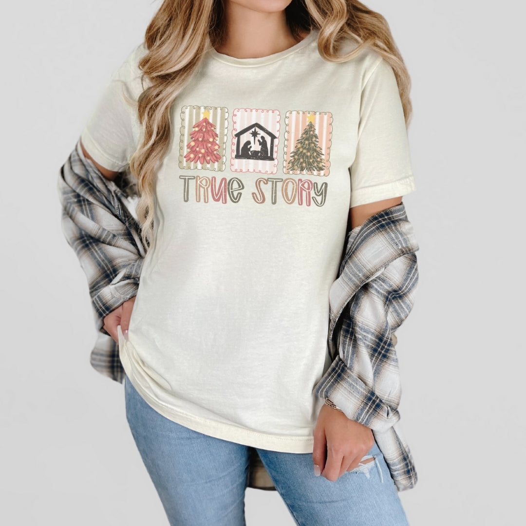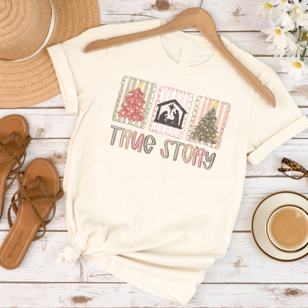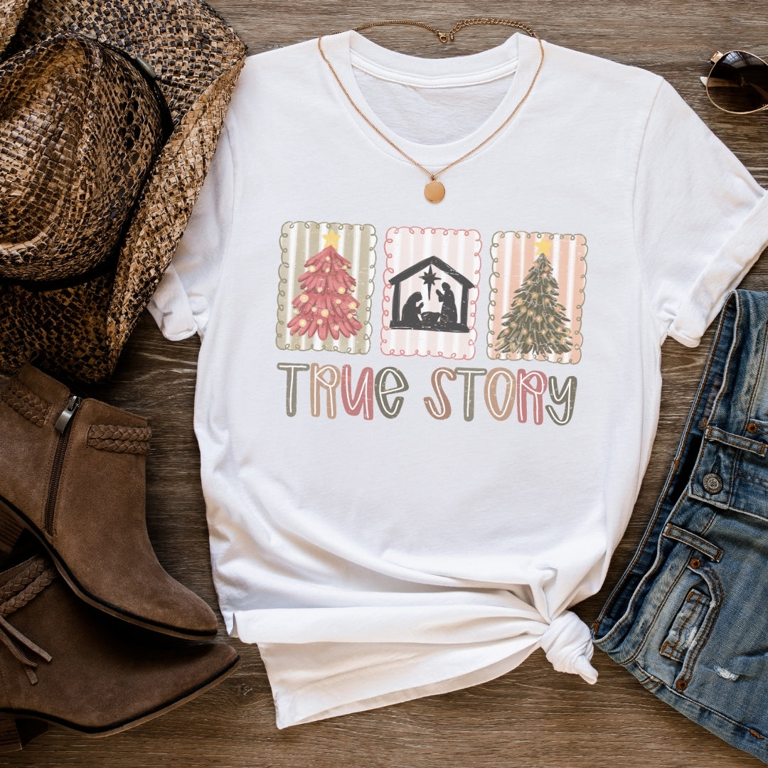 Celebrate Christmas with a design that blends festive cheer and deep meaning. Featuring hand-drawn Christmas trees and a nativity silhouette framed like vintage postage stamps, this tee proclaims the message: “True Story.”