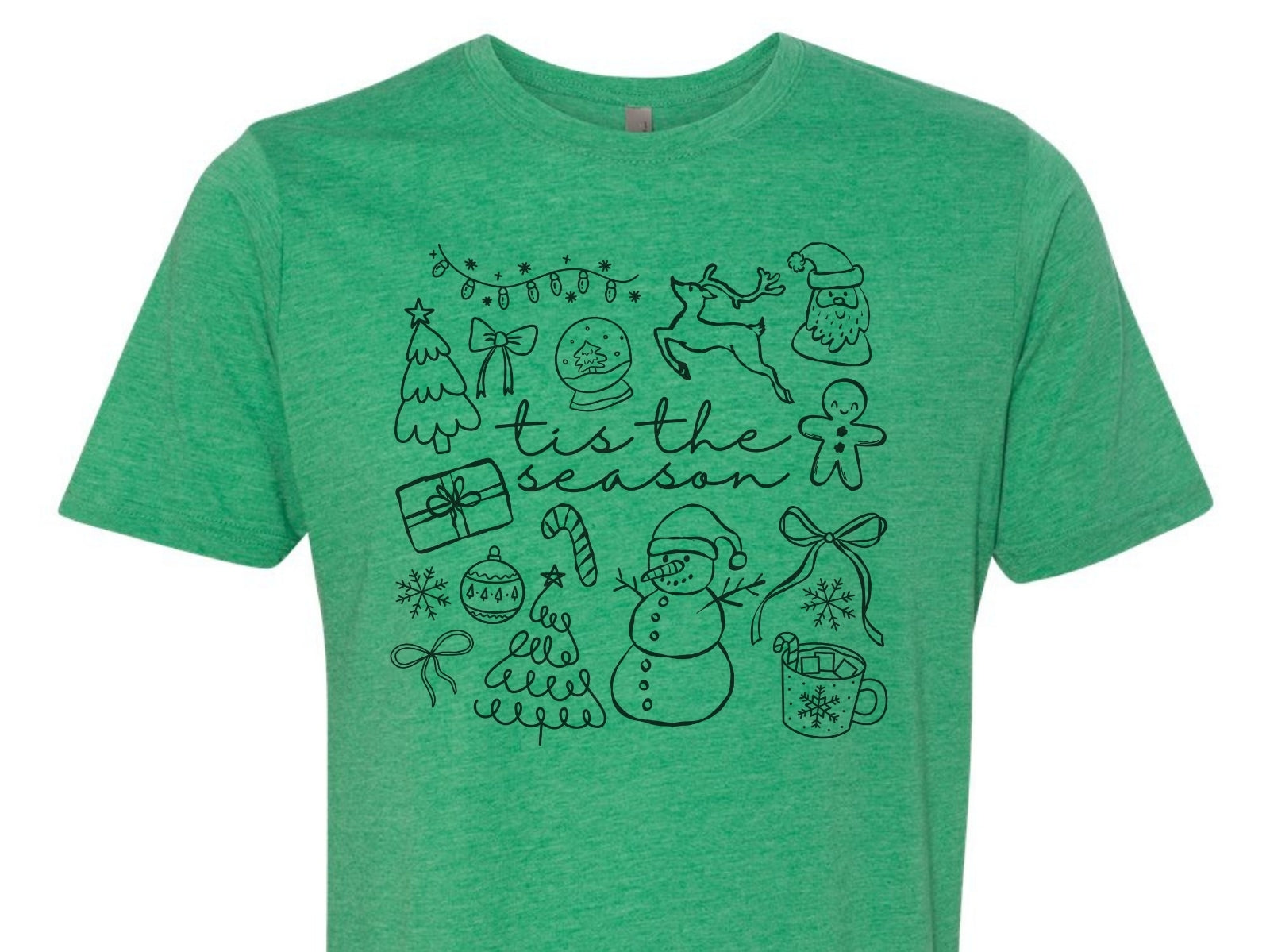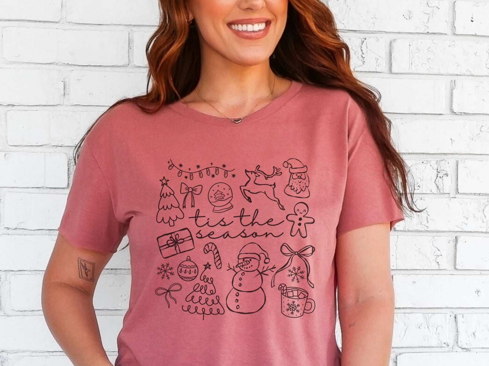 Add a touch of festive charm to your wardrobe with our Tis the Season doodle tee! This minimalist black-line design features hand-drawn Christmas icons like Santa, reindeer, gingerbread, snowmen, ornaments, and more – all arranged around the cheerful phrase “tis the season.”