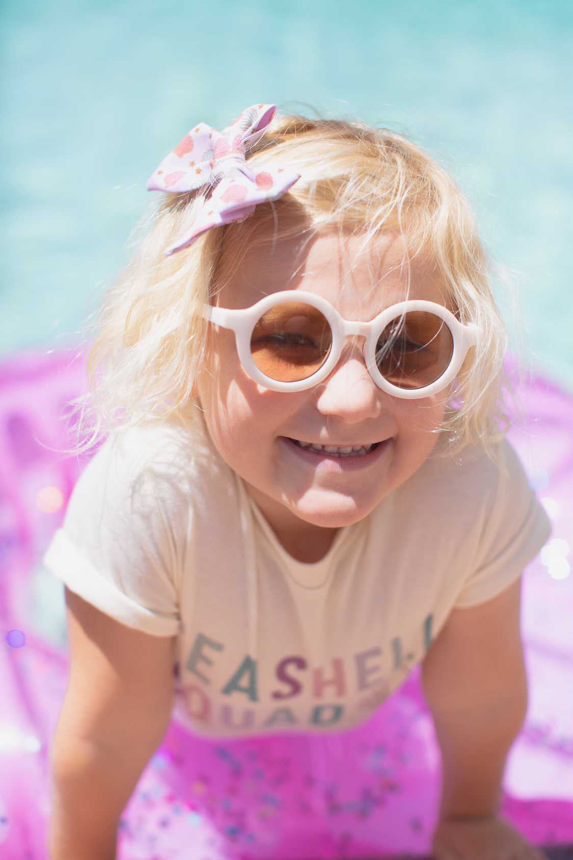 Get ready for summer in these adorable summer sunglasses!  Super trendy and pairs well with bathing suits and all your summer outfits!  Smaller Frame fits most kids 5 and under.  Grab yours today!  Only a few available in each color!