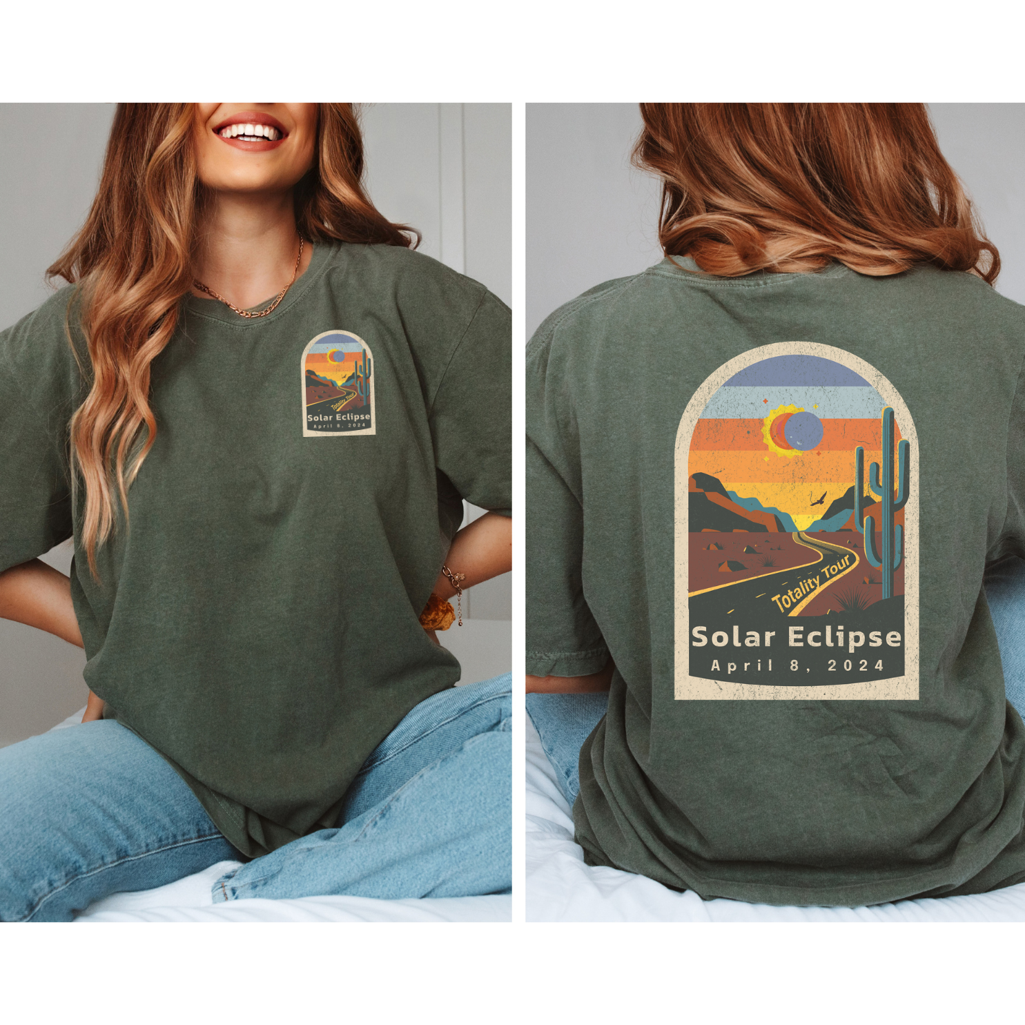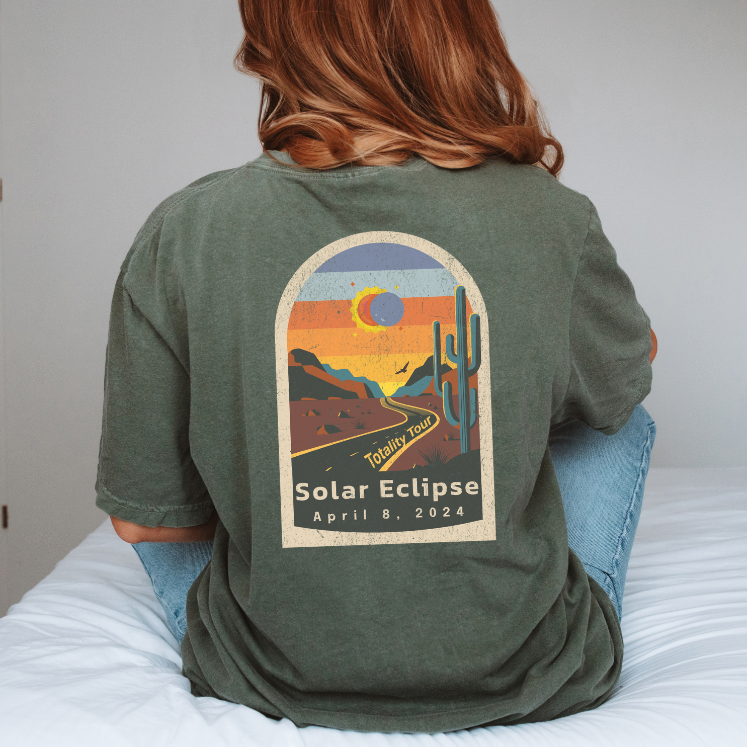 Experience the once in a life time solar eclipse wearing the Totality Tour Solar Eclipse T-shirt! Featuring a stunning desert mountain scene and a solar eclipse, this shirt will inspire your sense of adventure and wonder. Don't miss out on the opportunity to witness the eclipse on April 8, 2024.