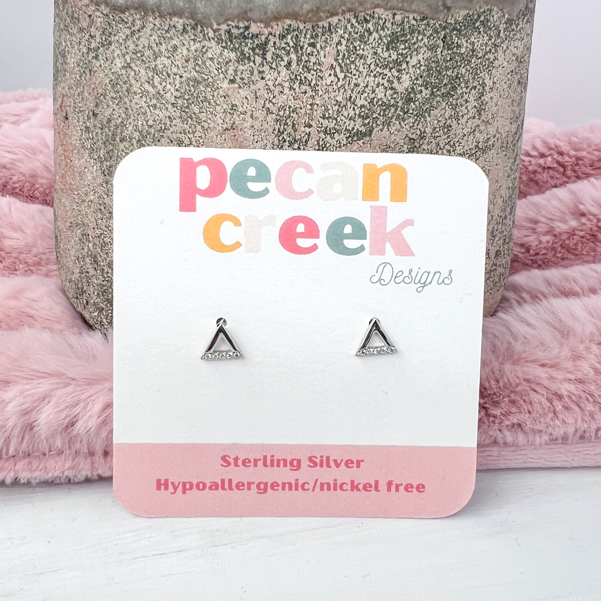 Shine bright and stand out with our Triangle cubic zirconia Earrings! Made with sterling silver, these small stud earrings feature a stunning triangle design with rhinestones for the perfect touch of sparkle. Elevate any outfit and make a statement with these unique earrings.