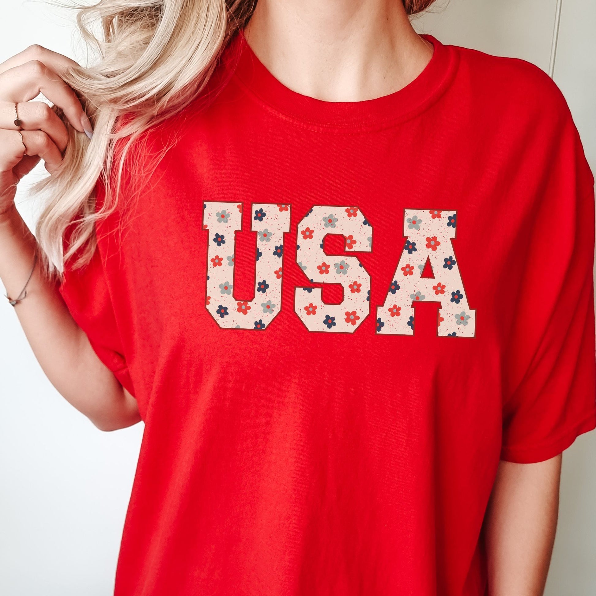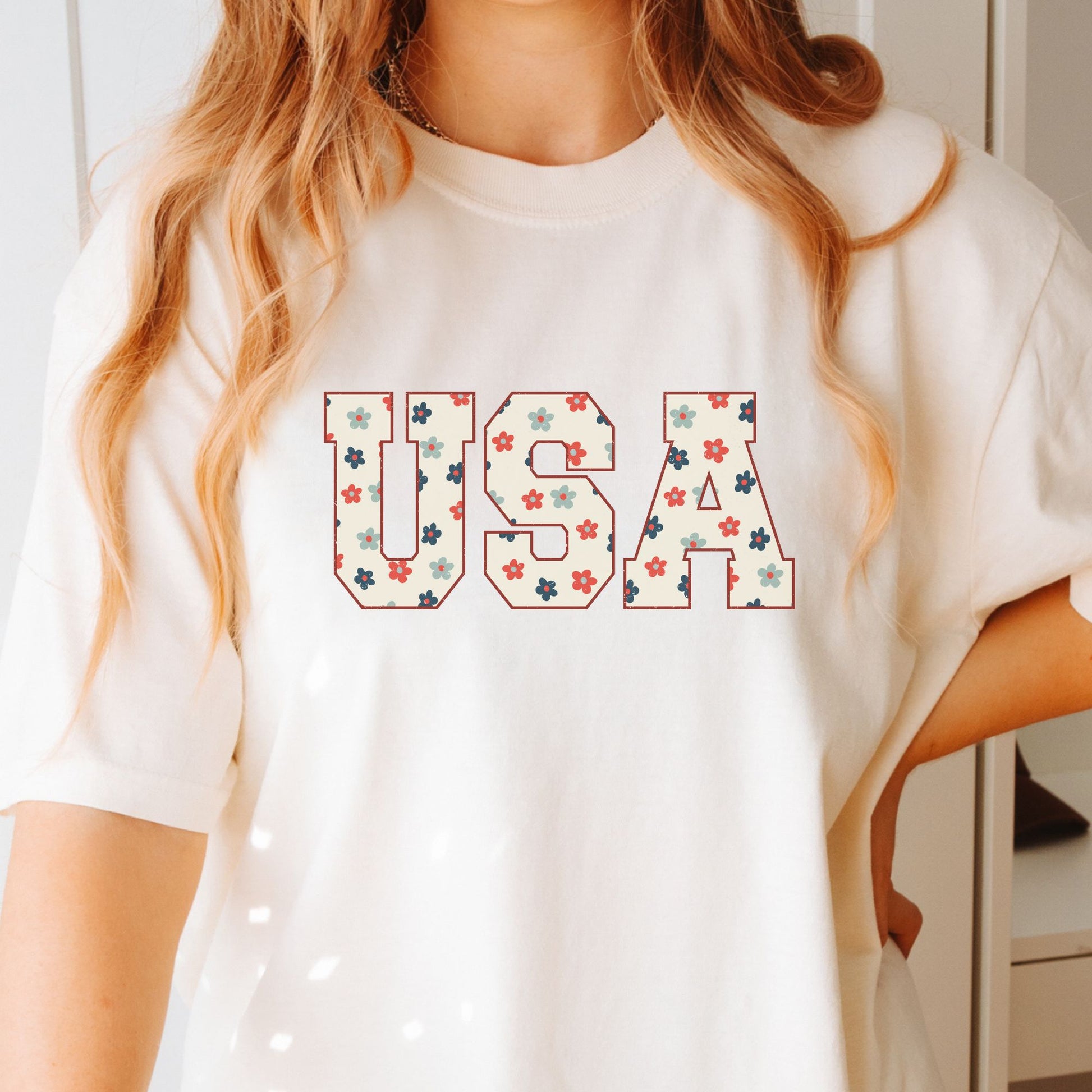 Celebrate your patriotic spirit with this playful USA Floral T-shirt, perfect for July 4th and Memorial Day. Featuring a vibrant floral design that blends classic American pride with a fresh, fun twist, this tee offers both comfort and style. Made from soft Comfort Colors fabric, it’s ideal for all-day wear during your summer festivities. Show off your love for the USA with a cheerful, eye-catching look that’s as spirited as you are!