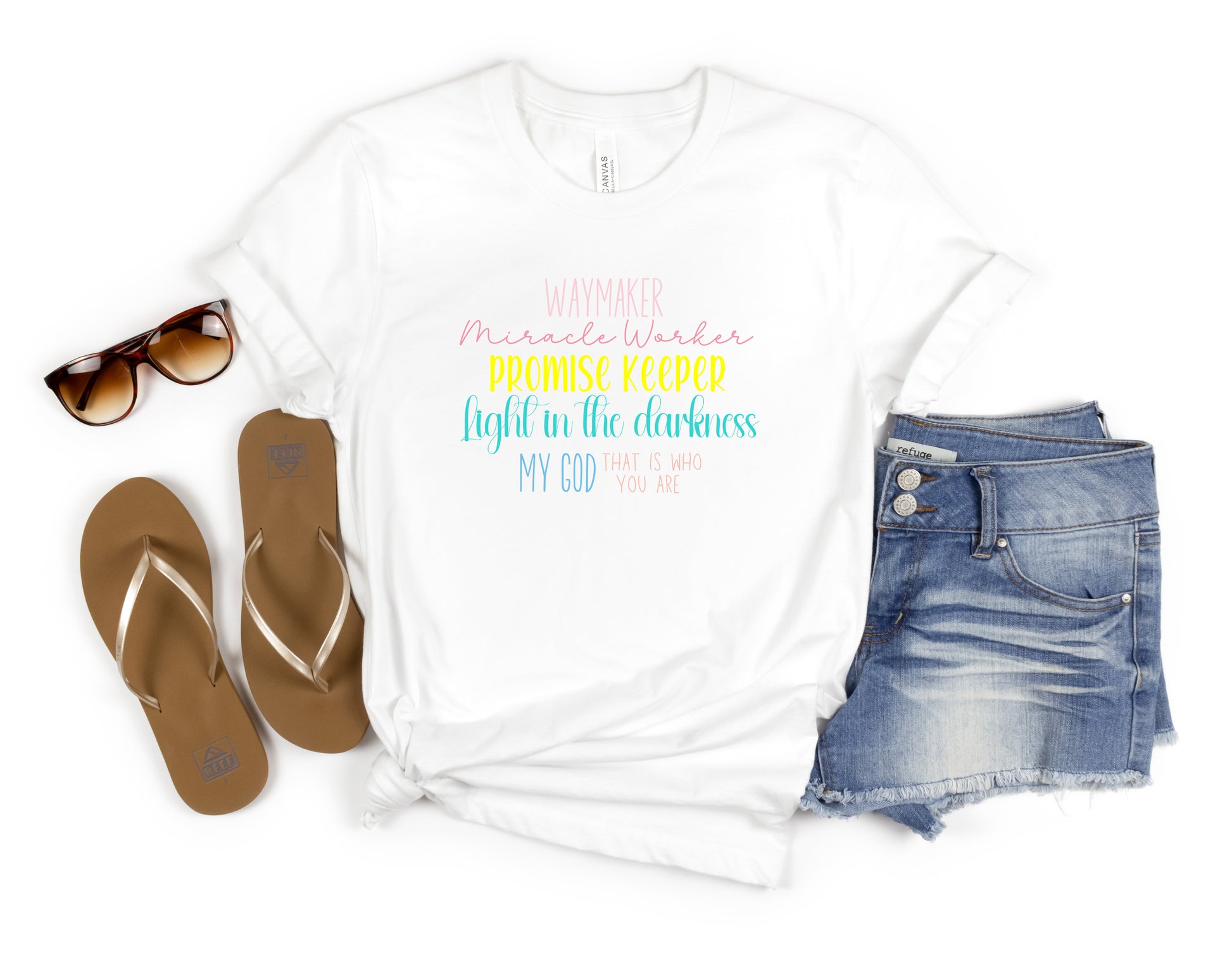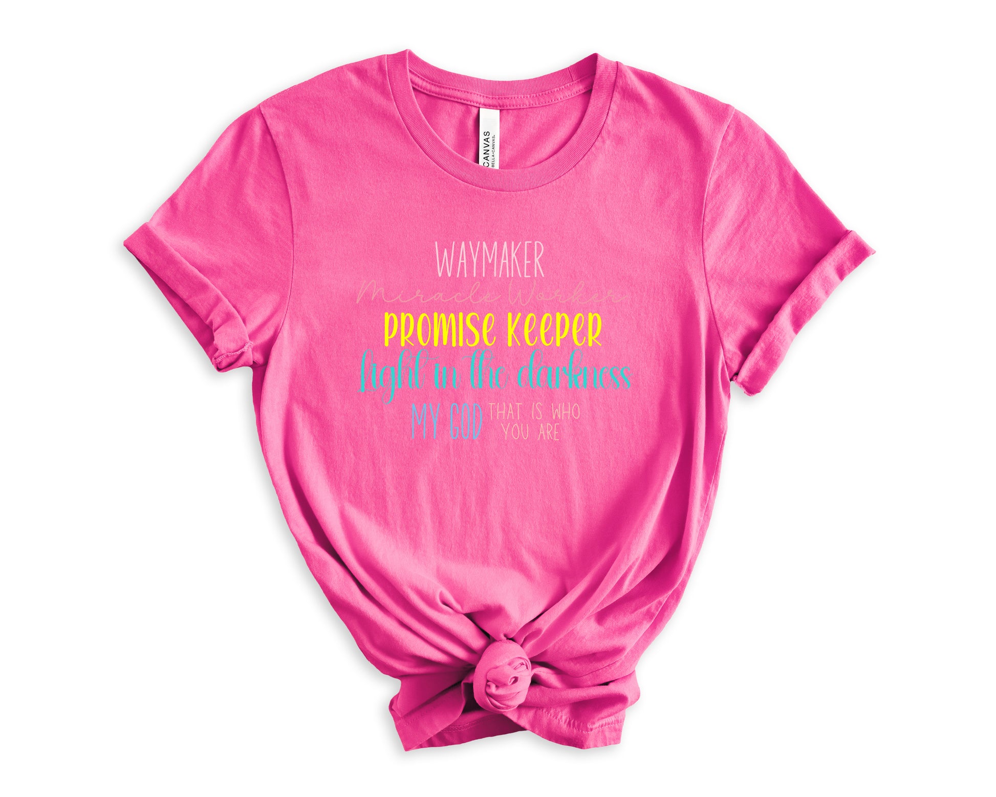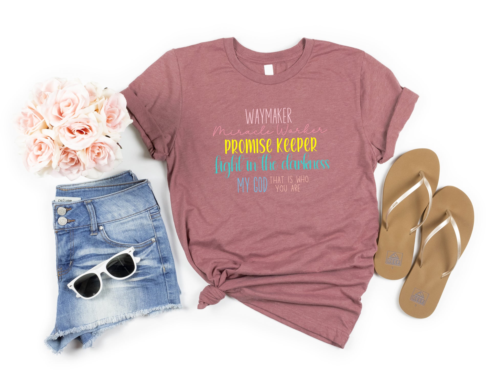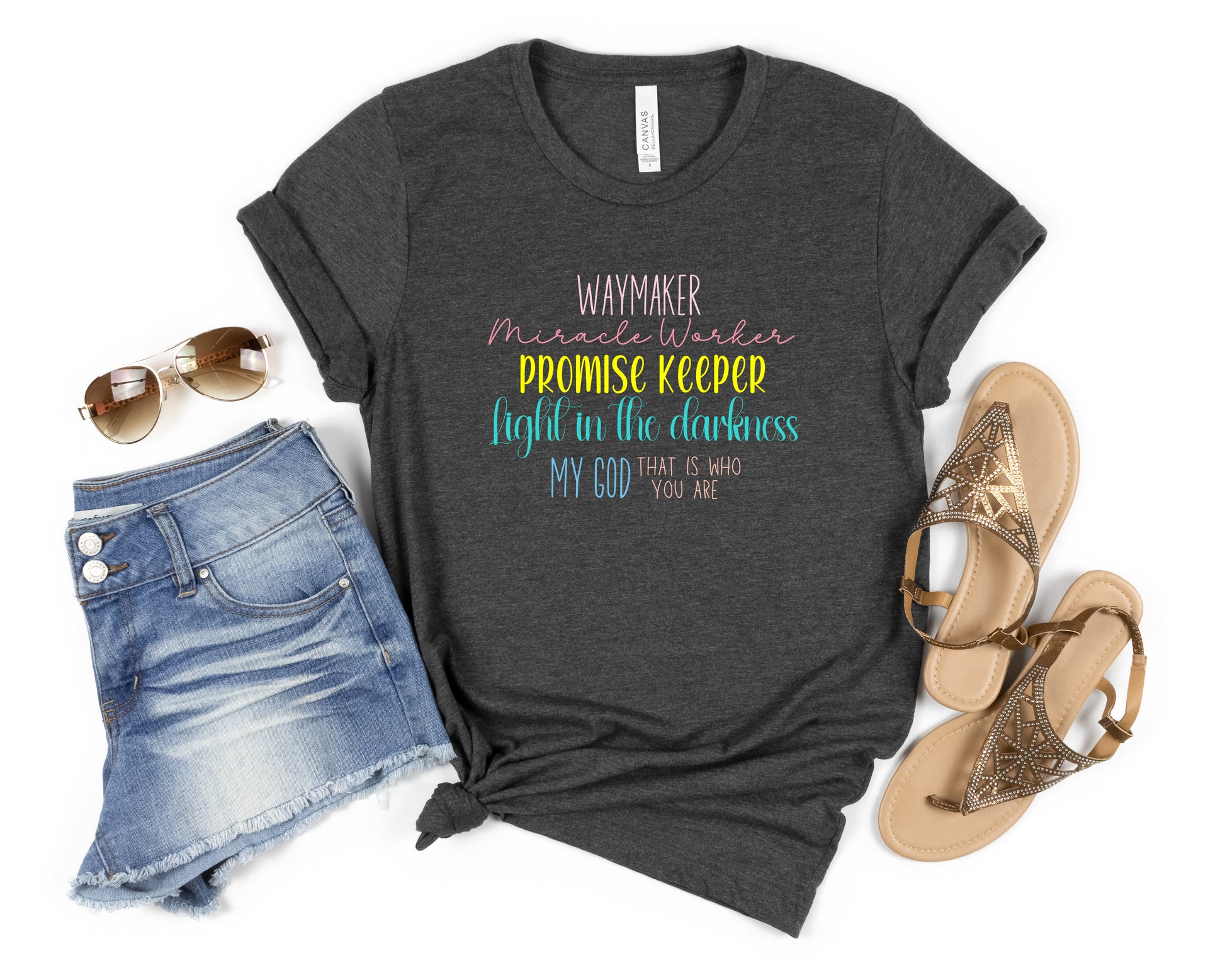 The Waymaker Miracle Worker Women's Graphic Tshirt is the perfect addition to your wardrobe. This religious t-shirt features a "Waymaker Miracle Worker Promise Keeper Light in the Darkness" graphic that will inspire and uplift you.